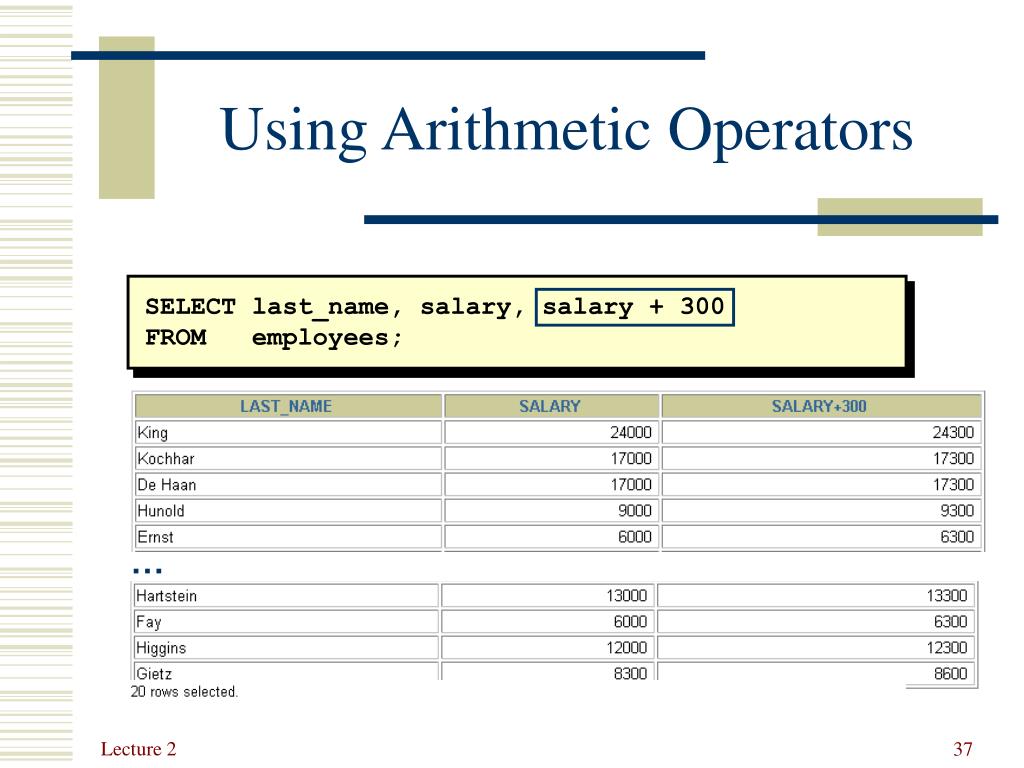 Using Arithmetic Operators SELECT last_name, salary, salary + 300 FROM employees; …