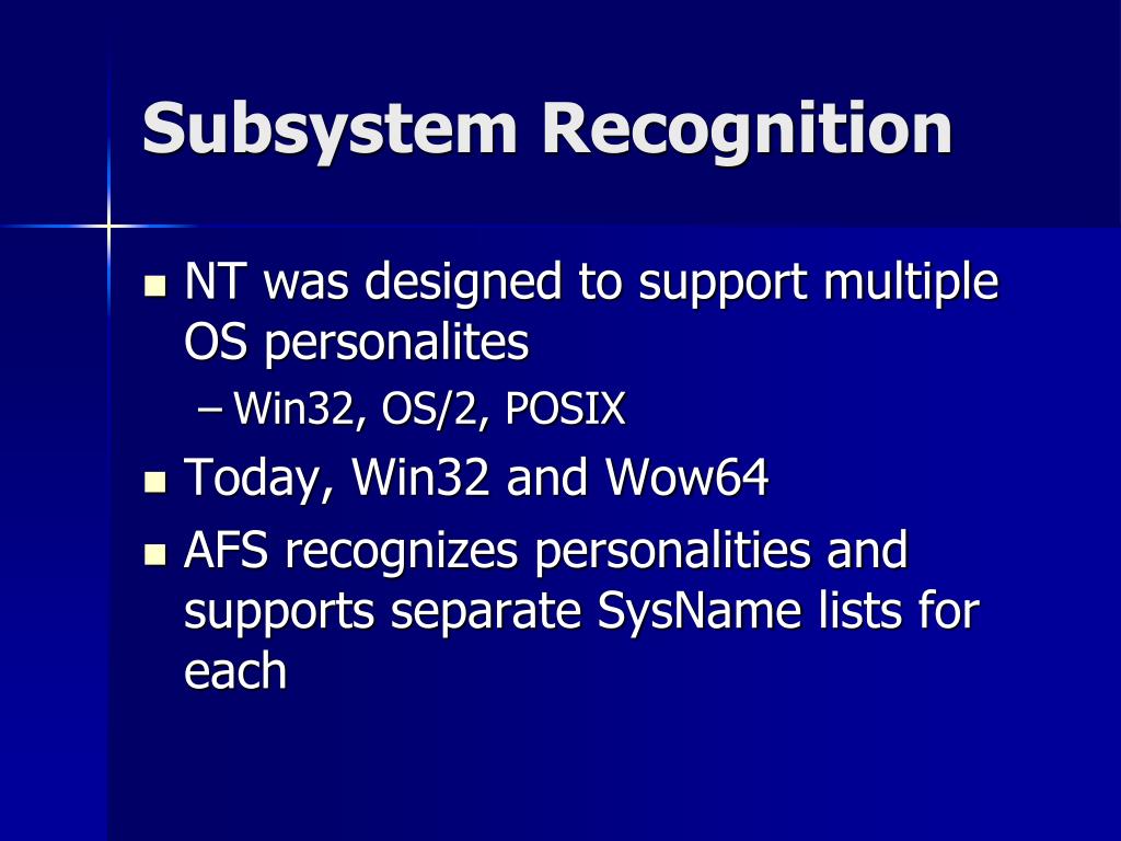 Subsystem Recognition • NT was designed to support multiple OS personalites • Win32, OS/2, POSIX • Today, Win32 and Wow64 • AFS recognizes personalities and supports separate SysName lists for each