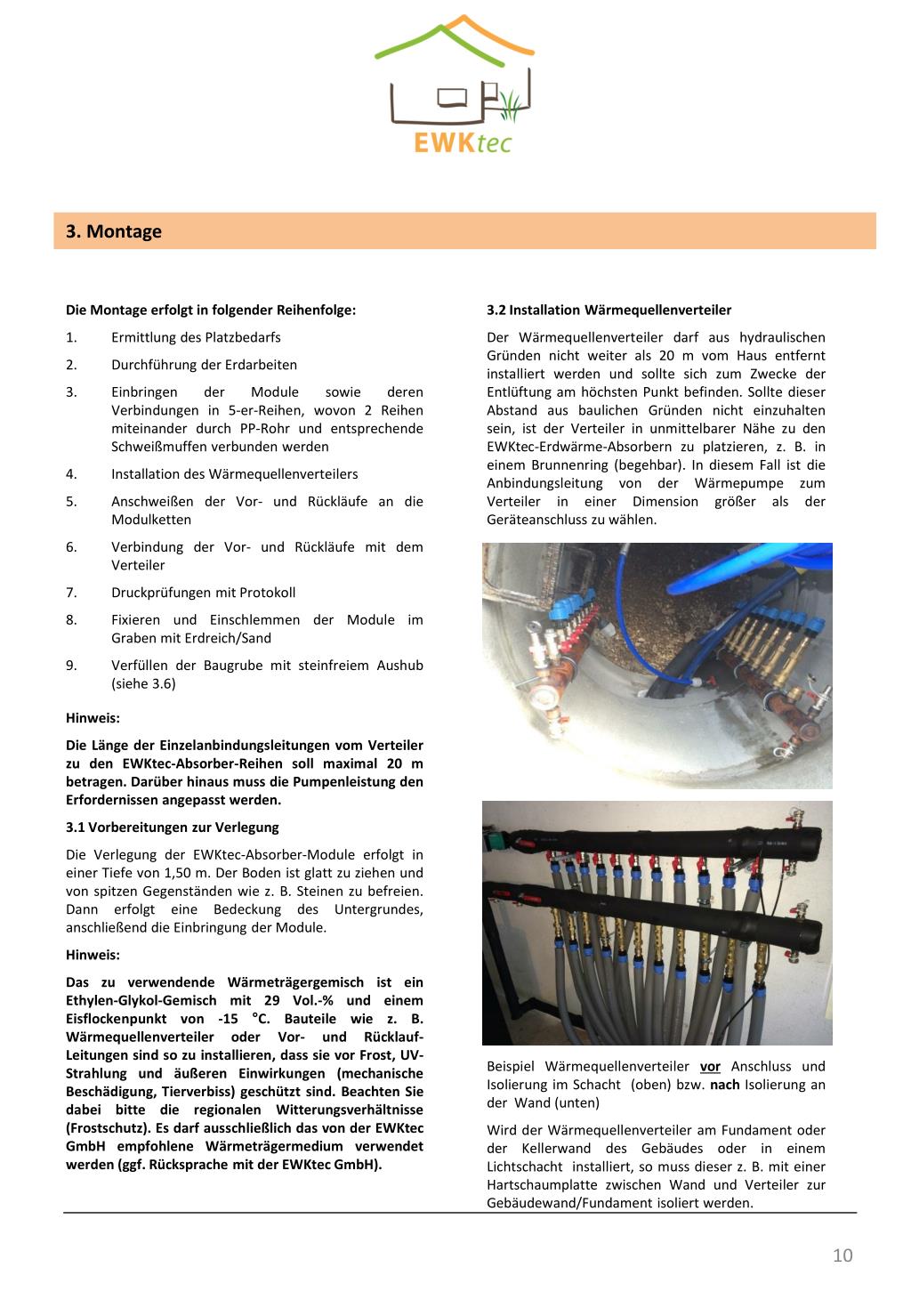 3. Montage • Die Montage erfolgt in folgender Reihenfolge: • Ermittlung des Platzbedarfs • Durchführung der Erdarbeiten • Einbringen der Module sowie deren Verbindungen in 5-er-Reihen, wovon 2 Reihen miteinander durch PP-Rohr und entsprechende Schweißmuffen verbunden werden • Installation des Wärmequellenverteilers • Anschweißen der Vor- und Rückläufe an die Modulketten • Verbindung der Vor- und Rückläufe mit dem Verteiler • Druckprüfungen mit Protokoll • Fixieren und Einschlemmen der Module im Graben mit Erdreich/Sand • 9. Verfüllen der Baugrube mit steinfreiem Aushub (siehe 3.6) 3.2 Installation Wärmequellenverteiler Der Wärmequellenverteiler darf aus hydraulischen Gründen nicht weiter als 20 m vom Haus entfernt installiert werden und sollte sich zum Zwecke der Entlüftung am höchsten Punkt befinden. Sollte dieser Abstand aus baulichen Gründen nicht einzuhalten sein, ist der Verteiler in unmittelbarer Nähe zu den EWKtec-Erdwärme-Absorbern zu platzieren, z. B. in einem Brunnenring (begehbar). In diesem Fall ist die Anbindungsleitung von der Wärmepumpe zum Verteiler in einer Dimension größer als der Geräteanschluss zu wählen. Beispiel Wärmequellenverteiler vorAnschluss und Isolierung im Schacht (oben) bzw. nach Isolierung an der Wand (unten) Wird der Wärmequellenverteiler am Fundament oder der Kellerwand des Gebäudes oder in einem Lichtschacht installiert, so muss dieser z. B. mit einer Hartschaumplatte zwischen Wand und Verteiler zur Gebäudewand/Fundament isoliert werden. Hinweis: Die Länge der Einzelanbindungsleitungen vom Verteiler zu den EWKtec-Absorber-Reihen soll maximal 20 m betragen. Darüber hinaus muss die Pumpenleistung den Erfordernissen angepasst werden. 3.1 Vorbereitungen zur Verlegung Die Verlegung der EWKtec-Absorber-Module erfolgt in einer Tiefe von 1,50 m. Der Boden ist glatt zu ziehen und von spitzen Gegenständen wie z. B. Steinen zu befreien. Dann erfolgt eine Bedeckung des Untergrundes, anschließend die Einbringung der Module. Hinweis: Das zu verwendende Wärmeträgergemisch ist ein Ethylen-Glykol-Gemisch mit 29 Vol.-% und einem Eisflockenpunkt von -15 °C. Bauteile wie z. B. Wärmequellenverteiler oder Vor- und Rücklauf-Leitungen sind so zu installieren, dass sie vor Frost, UV-Strahlung und äußeren Einwirkungen (mechanische Beschädigung, Tierverbiss) geschützt sind. Beachten Sie dabei bitte die regionalen Witterungsverhältnisse (Frostschutz). Es darf ausschließlich das von der EWKtec GmbH empfohlene Wärmeträgermedium verwendet werden (ggf. Rücksprache mit der EWKtec GmbH).