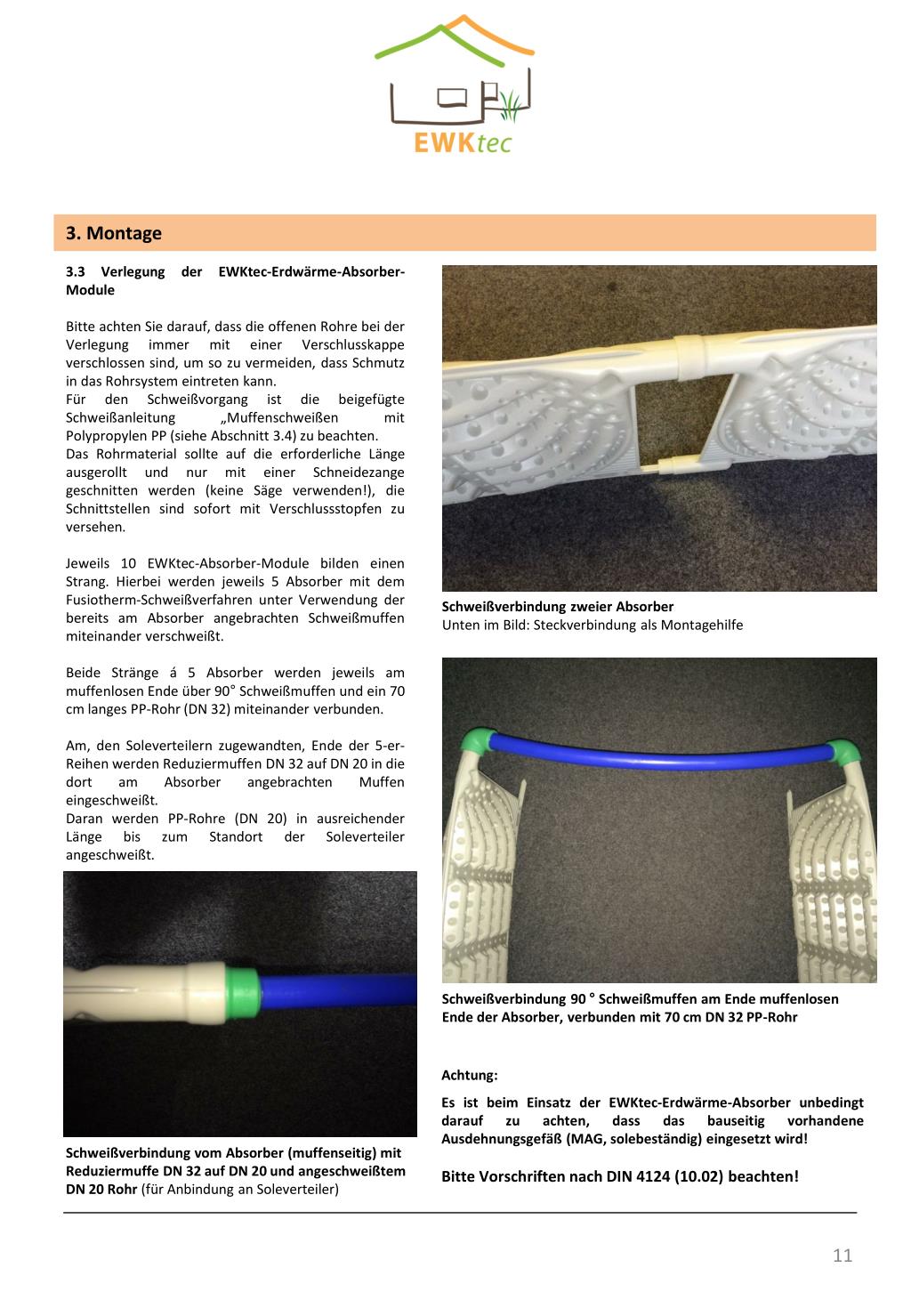 3. Montage 3.3 Verlegung der EWKtec-Erdwärme-Absorber-Module Bitte achten Sie darauf, dass die offenen Rohre bei der Verlegung immer mit einer Verschlusskappe verschlossen sind, um so zu vermeiden, dass Schmutz in das Rohrsystem eintreten kann. Für den Schweißvorgang ist die beigefügte Schweißanleitung „Muffenschweißen mit PolypropylenPP (siehe Abschnitt 3.4) zu beachten. Das Rohrmaterial sollte auf die erforderliche Länge ausgerollt und nur mit einer Schneidezange geschnitten werden (keine Säge verwenden!), die Schnittstellen sind sofort mit Verschlussstopfen zu versehen. Jeweils 10 EWKtec-Absorber-Module bilden einen Strang. Hierbei werden jeweils 5 Absorber mit dem Fusiotherm-Schweißverfahren unter Verwendung der bereits am Absorber angebrachten Schweißmuffen miteinander verschweißt. Beide Stränge á 5 Absorber werden jeweils am muffenlosen Ende über 90° Schweißmuffen und ein 70 cm langes PP-Rohr (DN 32) miteinander verbunden. Am, den Soleverteilern zugewandten, Ende der 5-er-Reihen werden Reduziermuffen DN 32 auf DN 20 in die dort am Absorber angebrachten Muffen eingeschweißt. Daran werden PP-Rohre (DN 20) in ausreichender Länge bis zum Standort der Soleverteiler angeschweißt. Die Vor- und Rücklaufleitungen von den Absorber-Reihen zu den Sole-Verteilern sollten mit geringem Abstand nebeneinander auf dem Erdboden verlegt werden. (nicht bündeln!) Schweißverbindung zweier AbsorberUnten im Bild: Steckverbindung als Montagehilfe Schweißverbindung 90 ° Schweißmuffen am Ende muffenlosen Ende der Absorber, verbunden mit 70 cm DN 32 PP-Rohr Achtung: Es ist beim Einsatz der EWKtec-Erdwärme-Absorber unbedingt darauf zu achten, dass das bauseitig vorhandene Ausdehnungsgefäß (MAG, solebeständig) eingesetzt wird! Schweißverbindung vom Absorber (muffenseitig) mit Reduziermuffe DN 32 auf DN 20 und angeschweißtem DN 20 Rohr (für Anbindung an Soleverteiler) Bitte Vorschriften nach DIN 4124 (10.02) beachten!