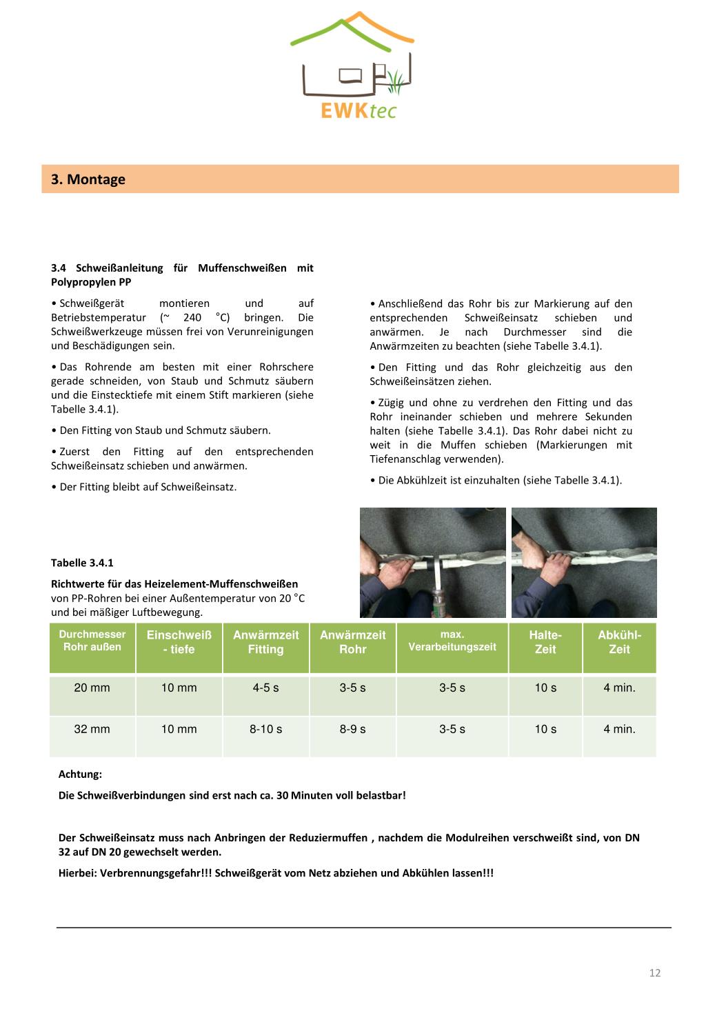 3. Montage • Anschließend das Rohr bis zur Markierung auf den entsprechenden Schweißeinsatz schieben und anwärmen. Je nach Durchmesser sind die Anwärmzeiten zu beachten (siehe Tabelle 3.4.1). • Den Fitting und das Rohr gleichzeitig aus den Schweißeinsätzen ziehen. • Zügig und ohne zu verdrehen den Fitting und das Rohr ineinander schieben und mehrere Sekunden halten (siehe Tabelle 3.4.1). Das Rohr dabei nicht zu weit in die Muffen schieben (Markierungen mit Tiefenanschlag verwenden). • Die Abkühlzeit ist einzuhalten (siehe Tabelle 3.4.1). • 3.4 Schweißanleitung für Muffenschweißen mit PolypropylenPP • Schweißgerät montieren und auf Betriebstemperatur (~ 240 °C) bringen. Die Schweißwerkzeuge müssen frei von Verunreinigungen und Beschädigungen sein. • Das Rohrende am besten mit einer Rohrschere gerade schneiden, von Staub und Schmutz säubern und die Einstecktiefe mit einem Stift markieren (siehe Tabelle 3.4.1). • Den Fitting von Staub und Schmutz säubern. • Zuerst den Fitting auf den entsprechenden Schweißeinsatz schieben und anwärmen. • Der Fitting bleibt auf Schweißeinsatz. Tabelle 3.4.1 Richtwerte für das Heizelement-Muffenschweißenvon PP-Rohren bei einer Außentemperatur von 20 °C und bei mäßiger Luftbewegung. Achtung: Die Schweißverbindungen sind erst nach ca. 30 Minuten voll belastbar! Der Schweißeinsatz muss nach Anbringen der Reduziermuffen , nachdem die Modulreihen verschweißt sind, von DN 32 auf DN 20 gewechselt werden. Hierbei: Verbrennungsgefahr!!! Schweißgerät vom Netz abziehen und Abkühlen lassen!!!