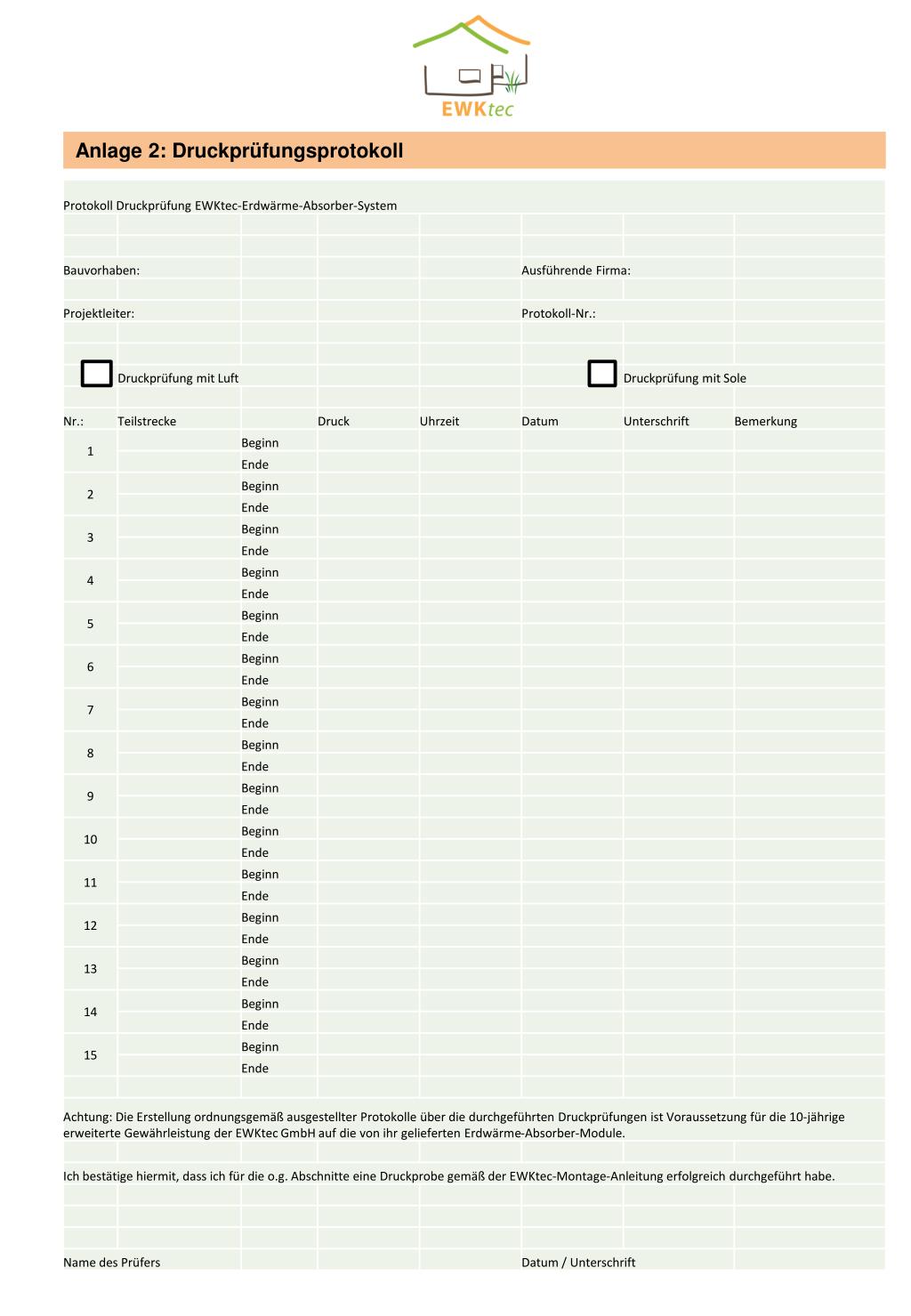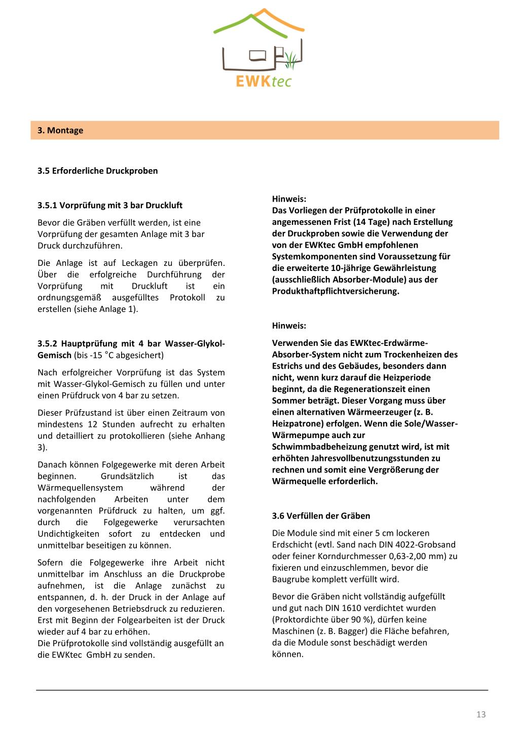 3. Montage 3.5 Erforderliche Druckproben 3.5.1 Vorprüfung mit 3 bar Druckluft Bevor die Gräben verfüllt werden, ist eine Vorprüfung der gesamten Anlage mit 3 bar Druck durchzuführen. Die Anlage ist auf Leckagen zu überprüfen. Über die erfolgreiche Durchführung der Vorprüfung mit Druckluft ist ein ordnungsgemäß ausgefülltes Protokoll zu erstellen (siehe Anlage 1). 3.5.2 Hauptprüfung mit 4 bar Wasser-Glykol-Gemisch (bis -15 °C abgesichert) Nach erfolgreicher Vorprüfung ist das System mit Wasser-Glykol-Gemisch zu füllen und unter einen Prüfdruck von 4bar zu setzen. Dieser Prüfzustand ist über einen Zeitraum von mindestens 12 Stunden aufrecht zu erhalten und detailliert zu protokollieren (siehe Anhang 3). Danach können Folgegewerke mit deren Arbeit beginnen. Grundsätzlich ist das Wärmequellensystem während der nachfolgenden Arbeiten unter dem vorgenannten Prüfdruck zu halten, um ggf. durch die Folgegewerke verursachten Undichtigkeiten sofort zu entdecken und unmittelbar beseitigen zu können. Sofern die Folgegewerke ihre Arbeit nicht unmittelbar im Anschluss an die Druckprobe aufnehmen, ist die Anlage zunächst zu entspannen, d. h. der Druck in der Anlage auf den vorgesehenen Betriebsdruck zu reduzieren. Erst mit Beginn der Folgearbeiten ist der Druck wieder auf 4bar zu erhöhen. Die Prüfprotokolle sind vollständig ausgefüllt an die EWKtec GmbH zu senden. Hinweis: Das Vorliegen der Prüfprotokolle in einer angemessenen Frist (14 Tage) nach Erstellung der Druckproben sowie die Verwendung der von der EWKtec GmbH empfohlenen Systemkomponenten sind Voraussetzung für die erweiterte 10-jährige Gewährleistung (ausschließlich Absorber-Module) aus der Produkthaftpflichtversicherung. Hinweis: Verwenden Sie das EWKtec-Erdwärme-Absorber-System nicht zum Trockenheizen des Estrichs und des Gebäudes, besonders dann nicht, wenn kurz darauf die Heizperiode beginnt, da die Regenerationszeit einen Sommer beträgt. Dieser Vorgang muss über einen alternativen Wärmeerzeuger (z. B. Heizpatrone) erfolgen. Wenn die Sole/Wasser-Wärmepumpe auch zur Schwimmbadbeheizung genutzt wird, ist mit erhöhten Jahresvollbenutzungsstunden zu rechnen und somit eine Vergrößerung der Wärmequelle erforderlich. 3.6 Verfüllen der Gräben Die Module sind mit einer 5 cm lockeren Erdschicht (evtl. Sand nach DIN 4022-Grobsand oder feiner Korndurchmesser 0,63-2,00 mm) zu fixieren und einzuschlemmen, bevor die Baugrube komplett verfüllt wird. Bevor die Gräben nicht vollständig aufgefüllt und gut nach DIN 1610 verdichtet wurden (Proktordichte über 90 %), dürfen keine Maschinen (z. B. Bagger) die Fläche befahren, da die Module sonst beschädigt werden können.