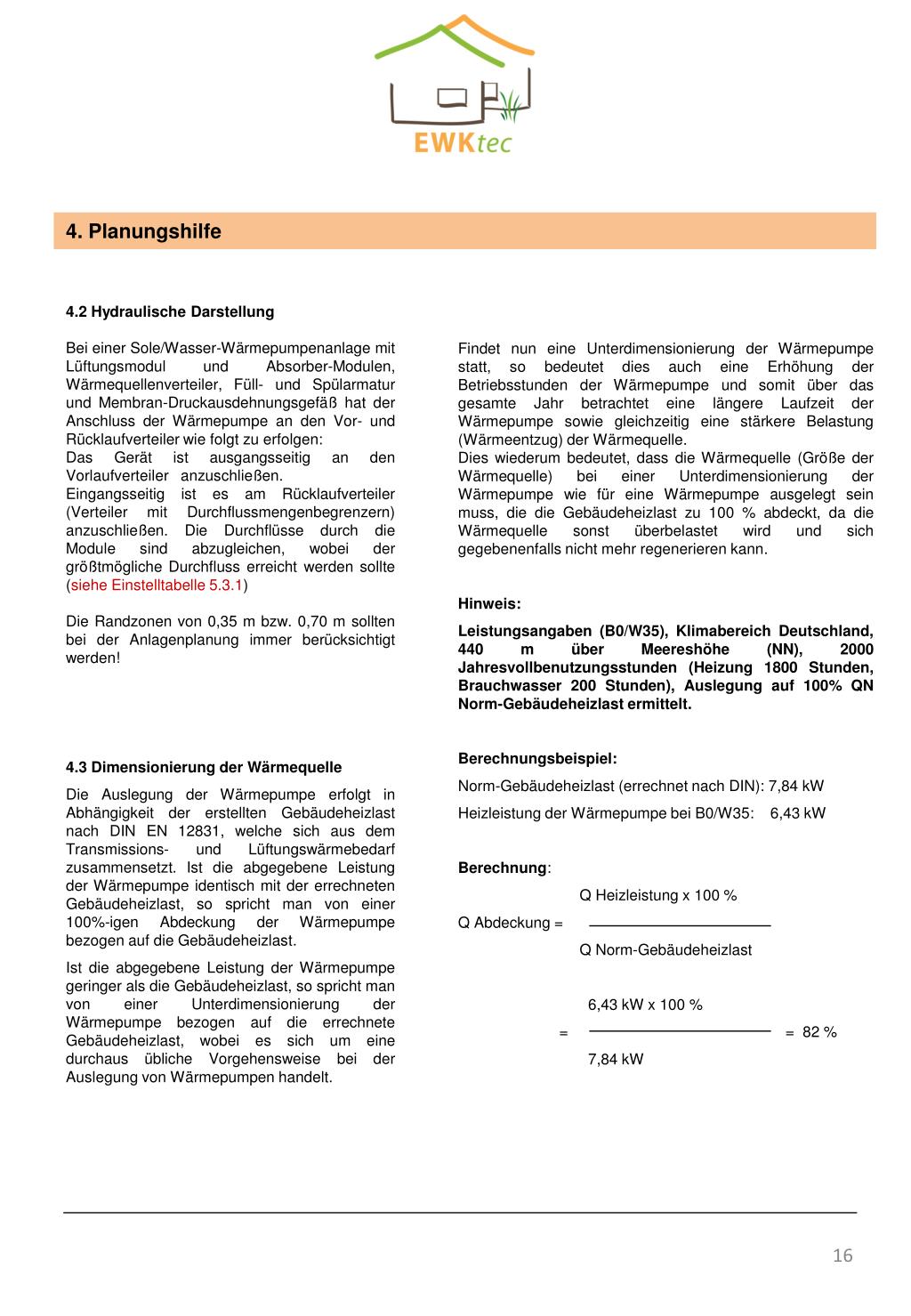 4. Planungshilfe 4.2 Hydraulische Darstellung Bei einer Sole/Wasser-Wärmepumpenanlage mit Lüftungsmodul und Absorber-Modulen, Wärmequellenverteiler, Füll- und Spülarmatur und Membran-Druckausdehnungsgefäß hat der Anschluss der Wärmepumpe an den Vor- und Rücklaufverteiler wie folgt zu erfolgen: Das Gerät ist ausgangsseitig an den Vorlaufverteiler anzuschließen. Eingangsseitig ist es am Rücklaufverteiler (Verteiler mit Durchflussmengenbegrenzern) anzuschließen. Die Durchflüsse durch die Module sind abzugleichen, wobei der größtmögliche Durchfluss erreicht werden sollte (siehe Einstelltabelle 5.3.1) Die Randzonen von 0,35 m bzw. 0,70 m sollten bei der Anlagenplanung immer berücksichtigt werden! 4.3 Dimensionierung der Wärmequelle Die Auslegung der Wärmepumpe erfolgt in Abhängigkeit der erstellten Gebäudeheizlast nach DIN EN 12831, welche sich aus dem Transmissions- und Lüftungswärmebedarf zusammensetzt. Ist die abgegebene Leistung der Wärmepumpe identisch mit der errechneten Gebäudeheizlast, so spricht man von einer 100%-igenAbdeckung der Wärmepumpe bezogen auf die Gebäudeheizlast. Ist die abgegebene Leistung der Wärmepumpe geringer als die Gebäudeheizlast, so spricht man von einer Unterdimensionierung der Wärmepumpe bezogen auf die errechnete Gebäudeheizlast, wobei es sich um eine durchaus übliche Vorgehensweise bei der Auslegung von Wärmepumpen handelt. Findet nun eine Unterdimensionierung der Wärmepumpe statt, so bedeutet dies auch eine Erhöhung der Betriebsstunden der Wärmepumpe und somit über das gesamte Jahr betrachtet eine längere Laufzeit der Wärmepumpe sowie gleichzeitig eine stärkere Belastung (Wärmeentzug) der Wärmequelle. Dies wiederum bedeutet, dass die Wärmequelle (Größe der Wärmequelle) bei einer Unterdimensionierung der Wärmepumpe wie für eine Wärmepumpe ausgelegt sein muss, die die Gebäudeheizlast zu 100 % abdeckt, da die Wärmequelle sonst überbelastet wird und sich gegebenenfalls nicht mehr regenerieren kann. Hinweis: Leistungsangaben (B0/W35), Klimabereich Deutschland, 440 m über Meereshöhe (NN), 2000 Jahresvollbenutzungsstunden (Heizung 1800 Stunden, Brauchwasser 200 Stunden), Auslegung auf 100% QN Norm-Gebäudeheizlast ermittelt. Berechnungsbeispiel: Norm-Gebäudeheizlast (errechnet nach DIN): 7,84 kW Heizleistung der Wärmepumpe bei B0/W35: 6,43 kW Berechnung: Q Heizleistung x 100 % Q Abdeckung = Q Norm-Gebäudeheizlast 6,43 kW x 100 % = = 82 % 7,84 kW