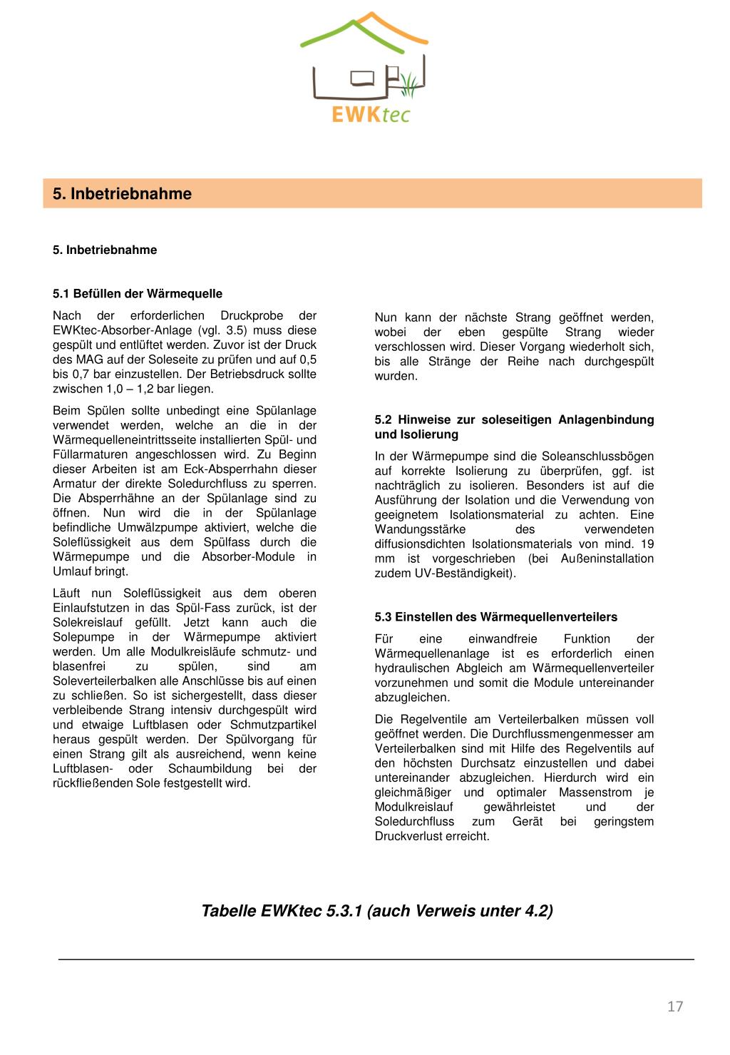 5. Inbetriebnahme 5. Inbetriebnahme 5.1 Befüllen der Wärmequelle Nach der erforderlichen Druckprobe der EWKtec-Absorber-Anlage (vgl. 3.5) muss diese gespült und entlüftet werden. Zuvor ist der Druck des MAG auf der Soleseite zu prüfen und auf 0,5 bis 0,7 bar einzustellen. Der Betriebsdruck sollte zwischen 1,0 – 1,2 bar liegen. Beim Spülen sollte unbedingt eine Spülanlage verwendet werden, welche an die in der Wärmequelleneintrittsseite installierten Spül- und Füllarmaturen angeschlossen wird. Zu Beginn dieser Arbeiten ist am Eck-Absperrhahn dieser Armatur der direkte Soledurchfluss zu sperren. Die Absperrhähne an der Spülanlage sind zu öffnen. Nun wird die in der Spülanlage befindliche Umwälzpumpe aktiviert, welche die Soleflüssigkeit aus dem Spülfass durch die Wärmepumpe und die Absorber-Module in Umlauf bringt. Läuft nun Soleflüssigkeit aus dem oberen Einlaufstutzen in das Spül-Fass zurück, ist der Solekreislauf gefüllt. Jetzt kann auch die Solepumpe in der Wärmepumpe aktiviert werden. Um alle Modulkreisläufe schmutz- und blasenfrei zu spülen, sind am Soleverteilerbalken alle Anschlüsse bis auf einen zu schließen. So ist sichergestellt, dass dieser verbleibende Strang intensiv durchgespült wird und etwaige Luftblasen oder Schmutzpartikel heraus gespült werden. Der Spülvorgang für einen Strang gilt als ausreichend, wenn keine Luftblasen- oder Schaumbildung bei der rückfließenden Sole festgestellt wird. Nun kann der nächste Strang geöffnet werden, wobei der eben gespülte Strang wieder verschlossen wird. Dieser Vorgang wiederholt sich, bis alle Stränge der Reihe nach durchgespült wurden. 5.2 Hinweise zur soleseitigen Anlagenbindung und Isolierung In der Wärmepumpe sind die Soleanschlussbögen auf korrekte Isolierung zu überprüfen, ggf. ist nachträglich zu isolieren. Besonders ist auf die Ausführung der Isolation und die Verwendung von geeignetem Isolationsmaterial zu achten. Eine Wandungsstärke des verwendeten diffusionsdichten Isolationsmaterials von mind. 19 mm ist vorgeschrieben (bei Außeninstallation zudem UV-Beständigkeit). 5.3 Einstellen des Wärmequellenverteilers Für eine einwandfreie Funktion der Wärmequellenanlage ist es erforderlich einen hydraulischen Abgleich am Wärmequellenverteiler vorzunehmen und somit die Module untereinander abzugleichen. Die Regelventile am Verteilerbalken müssen voll geöffnet werden. Die Durchflussmengenmesser am Verteilerbalken sind mit Hilfe des Regelventils auf den höchsten Durchsatz einzustellen und dabei untereinander abzugleichen. Hierdurch wird ein gleichmäßiger und optimaler Massenstrom je Modulkreislauf gewährleistet und der Soledurchfluss zum Gerät bei geringstem Druckverlust erreicht. Tabelle EWKtec 5.3.1 (auch Verweis unter 4.2)