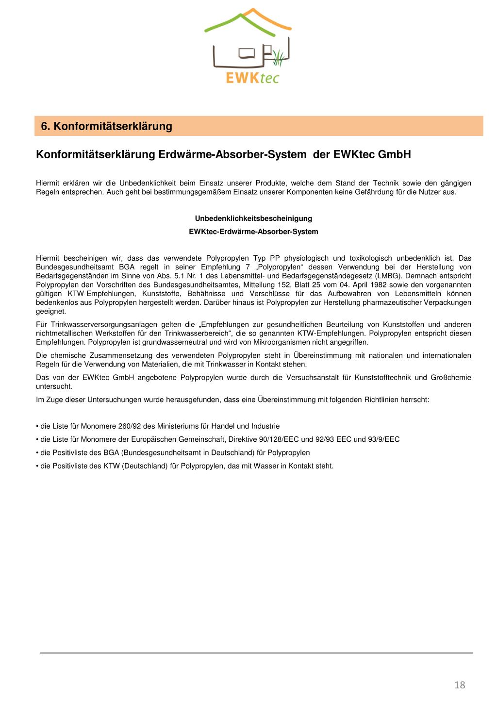 6. Konformitätserklärung • Konformitätserklärung Erdwärme-Absorber-System der EWKtec GmbH • Hiermit erklären wir die Unbedenklichkeit beim Einsatz unserer Produkte, welche dem Stand der Technik sowie den gängigen Regeln entsprechen. Auch geht bei bestimmungsgemäßem Einsatz unserer Komponenten keine Gefährdung für die Nutzer aus. • Unbedenklichkeitsbescheinigung • EWKtec-Erdwärme-Absorber-System • Hiermit bescheinigen wir, dass das verwendete Polypropylen Typ PP physiologisch und toxikologisch unbedenklich ist. Das Bundesgesundheitsamt BGA regelt in seiner Empfehlung 7 „Polypropylen“ dessen Verwendung bei der Herstellung von Bedarfsgegenständen im Sinne von Abs. 5.1 Nr. 1 des Lebensmittel- und Bedarfsgegenständegesetz (LMBG). Demnach entspricht Polypropylen den Vorschriften des Bundesgesundheitsamtes, Mitteilung 152, Blatt 25 vom 04. April 1982 sowie den vorgenannten gültigen KTW-Empfehlungen, Kunststoffe, Behältnisse und Verschlüsse für das Aufbewahren von Lebensmitteln können bedenkenlos aus Polypropylen hergestellt werden. Darüber hinaus ist Polypropylen zur Herstellung pharmazeutischer Verpackungen geeignet. • Für Trinkwasserversorgungsanlagen gelten die „Empfehlungen zur gesundheitlichen Beurteilung von Kunststoffen und anderen nichtmetallischen Werkstoffen für den Trinkwasserbereich“, die so genannten KTW-Empfehlungen. Polypropylen entspricht diesen Empfehlungen. Polypropylen ist grundwasserneutral und wird von Mikroorganismen nicht angegriffen. • Die chemische Zusammensetzung des verwendeten Polypropylen steht in Übereinstimmung mit nationalen und internationalen Regeln für die Verwendung von Materialien, die mit Trinkwasser in Kontakt stehen. • Das von der EWKtec GmbH angebotene Polypropylen wurde durch die Versuchsanstalt für Kunststofftechnik und Großchemie untersucht. • Im Zuge dieser Untersuchungen wurde herausgefunden, dass eine Übereinstimmung mit folgenden Richtlinien herrscht: • die Liste für Monomere 260/92 des Ministeriums für Handel und Industrie • die Liste für Monomere der Europäischen Gemeinschaft, Direktive 90/128/EEC und 92/93 EEC und 93/9/EEC • die Positivliste des BGA (Bundesgesundheitsamt in Deutschland) für Polypropylen • die Positivliste des KTW (Deutschland) für Polypropylen, das mit Wasser in Kontakt steht.