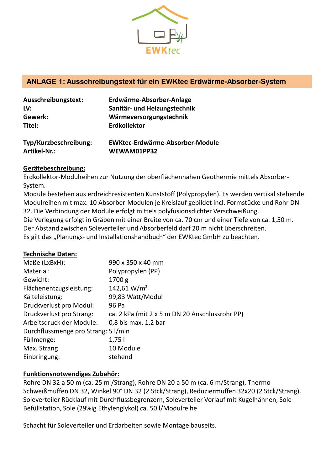 ANLAGE 1: Ausschreibungstext für ein EWKtec Erdwärme-Absorber-System Ausschreibungstext: Erdwärme-Absorber-Anlage LV: Sanitär- und Heizungstechnik Gewerk: Wärmeversorgungstechnik Titel: Erdkollektor Typ/Kurzbeschreibung: EWKtec-Erdwärme-Absorber-Module Artikel-Nr.: WEWAM01PP32 Gerätebeschreibung: Erdkollektor-Modulreihen zur Nutzung der oberflächennahen Geothermie mittels Absorber-System. Module bestehen aus erdreichresistenten Kunststoff (Polypropylen). Es werden vertikal stehende Modulreihen mit max. 10 Absorber-Modulen je Kreislauf gebildet incl. Formstücke und Rohr DN 32. Die Verbindung der Module erfolgt mittels polyfusionsdichter Verschweißung. Die Verlegung erfolgt in Gräben mit einer Breite von ca. 70 cm und einer Tiefe von ca. 1,50 m. Der Abstand zwischen Soleverteiler und Absorberfeld darf 20 m nicht überschreiten. Es gilt das „Planungs- und Installationshandbuch“ der EWKtec GmbH zu beachten. Technische Daten: Maße (LxBxH): 990 x 350 x 40 mm Material: Polypropylen (PP) Gewicht: 1700 g Flächenentzugsleistung: 142,61 W/m² Kälteleistung: 99,83 Watt/Modul Druckverlust pro Modul: 96 Pa Druckverlust pro Strang: ca. 2 kPa (mit 2 x 5 m DN 20 Anschlussrohr PP) Arbeitsdruck der Module: 0,8 bis max. 1,2 bar Durchflussmenge pro Strang: 5 l/min Füllmenge: 1,75 l Max. Strang 10 Module Einbringung: stehend Funktionsnotwendiges Zubehör: Rohre DN 32 a 50 m (ca. 25 m /Strang), Rohre DN 20 a 50 m (ca. 6 m/Strang), Thermo-Schweißmuffen DN 32, Winkel 90° DN 32 (2 Stck/Strang), Reduziermuffen 32x20 (2 Stck/Strang), Soleverteiler Rücklauf mit Durchflussbegrenzern, Soleverteiler Vorlauf mit Kugelhähnen, Sole-Befüllstation, Sole (29%ig Ethylenglykol) ca. 50 l/Modulreihe Schacht für Soleverteiler und Erdarbeiten sowie Montage bauseits.