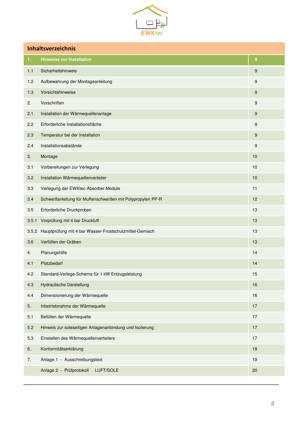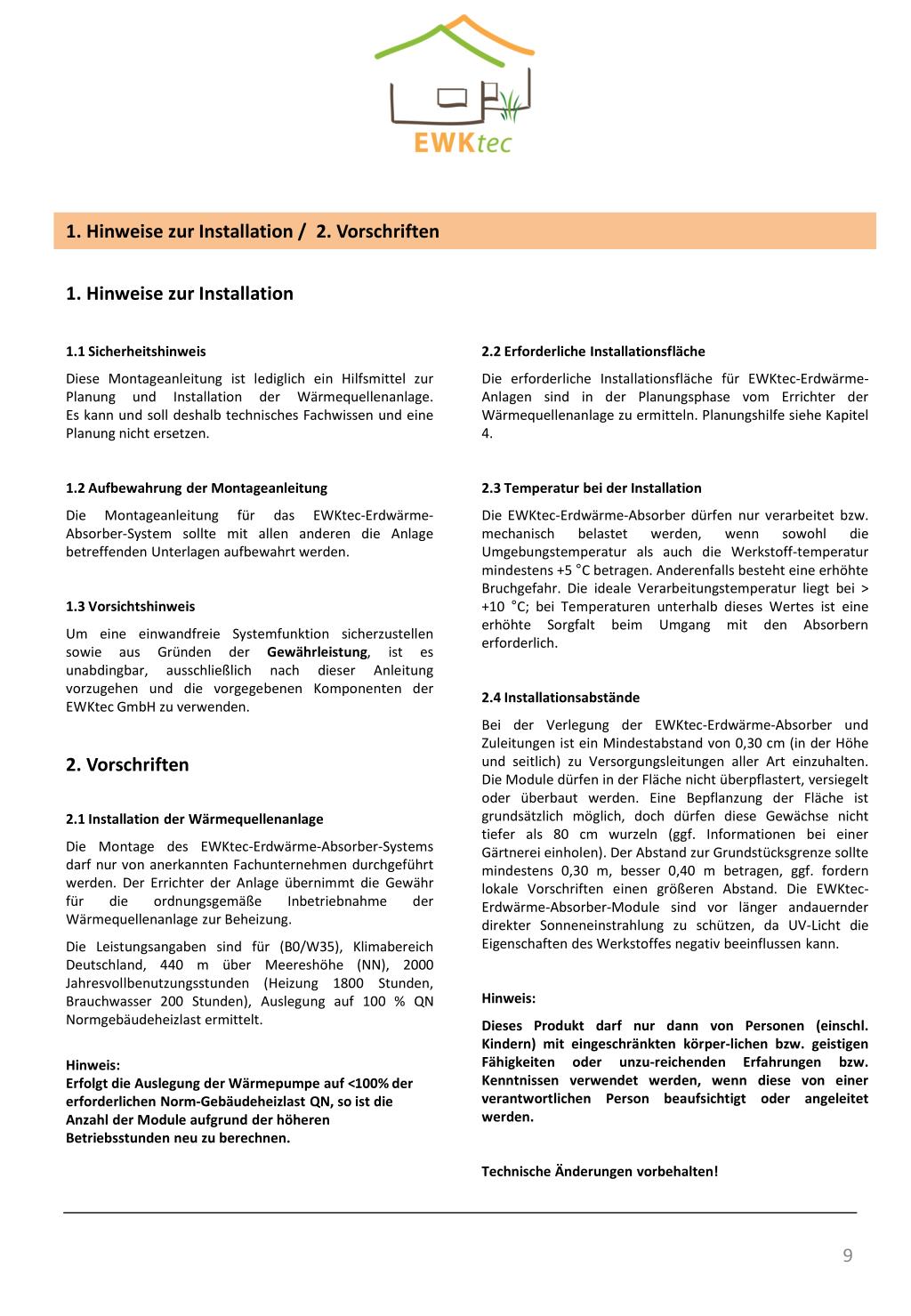 1. Hinweise zur Installation / 2. Vorschriften 1. Hinweise zur Installation 1.1 Sicherheitshinweis Diese Montageanleitung ist lediglich ein Hilfsmittel zur Planung und Installation der Wärmequellenanlage. Es kann und soll deshalb technisches Fachwissen und eine Planung nicht ersetzen. 1.2 Aufbewahrung der Montageanleitung Die Montageanleitung für das EWKtec-Erdwärme-Absorber-System sollte mit allen anderen die Anlage betreffenden Unterlagen aufbewahrt werden. 1.3 Vorsichtshinweis Um eine einwandfreie Systemfunktion sicherzustellen sowie aus Gründen der Gewährleistung, ist es unabdingbar, ausschließlich nach dieser Anleitung vorzugehen und die vorgegebenen Komponenten der EWKtec GmbH zu verwenden. 2. Vorschriften 2.1 Installation der Wärmequellenanlage Die Montage des EWKtec-Erdwärme-Absorber-Systems darf nur von anerkannten Fachunternehmen durchgeführt werden. Der Errichter der Anlage übernimmt die Gewähr für die ordnungsgemäße Inbetriebnahme der Wärmequellenanlage zur Beheizung. Die Leistungsangaben sind für (B0/W35), Klimabereich Deutschland, 440 m über Meereshöhe (NN), 2000 Jahresvollbenutzungsstunden (Heizung 1800 Stunden, Brauchwasser 200 Stunden), Auslegung auf 100 % QN Normgebäudeheizlast ermittelt. Hinweis: Erfolgt die Auslegung der Wärmepumpe auf <100% der erforderlichen Norm-Gebäudeheizlast QN, so ist die Anzahl der Module aufgrund der höheren Betriebsstunden neu zu berechnen. 2.2 Erforderliche Installationsfläche Die erforderliche Installationsfläche für EWKtec-Erdwärme-Anlagen sind in der Planungsphase vom Errichter der Wärmequellenanlage zu ermitteln. Planungshilfe siehe Kapitel 4. 2.3 Temperatur bei der Installation Die EWKtec-Erdwärme-Absorber dürfen nur verarbeitet bzw. mechanisch belastet werden, wenn sowohl die Umgebungstemperatur als auch die Werkstoff-temperatur mindestens +5 °C betragen. Anderenfalls besteht eine erhöhte Bruchgefahr. Die ideale Verarbeitungstemperatur liegt bei > +10 °C; bei Temperaturen unterhalb dieses Wertes ist eine erhöhte Sorgfalt beim Umgang mit den Absorbern erforderlich. 2.4 Installationsabstände Bei der Verlegung der EWKtec-Erdwärme-Absorber und Zuleitungen ist ein Mindestabstand von 0,30 cm (in der Höhe und seitlich) zu Versorgungsleitungen aller Art einzuhalten. Die Module dürfen in der Fläche nicht überpflastert, versiegelt oder überbaut werden. Eine Bepflanzung der Fläche ist grundsätzlich möglich, doch dürfen diese Gewächse nicht tiefer als 80 cm wurzeln (ggf. Informationen bei einer Gärtnerei einholen). Der Abstand zur Grundstücksgrenze sollte mindestens 0,30 m, besser 0,40 m betragen, ggf. fordern lokale Vorschriften einen größeren Abstand. Die EWKtec-Erdwärme-Absorber-Module sind vor länger andauernder direkter Sonneneinstrahlung zu schützen, da UV-Licht die Eigenschaften des Werkstoffes negativ beeinflussen kann. Hinweis: Dieses Produkt darf nur dann von Personen (einschl. Kindern) mit eingeschränkten körper-lichen bzw. geistigen Fähigkeiten oder unzu-reichenden Erfahrungen bzw. Kenntnissen verwendet werden, wenn diese von einer verantwortlichen Person beaufsichtigt oder angeleitet werden. Technische Änderungen vorbehalten!