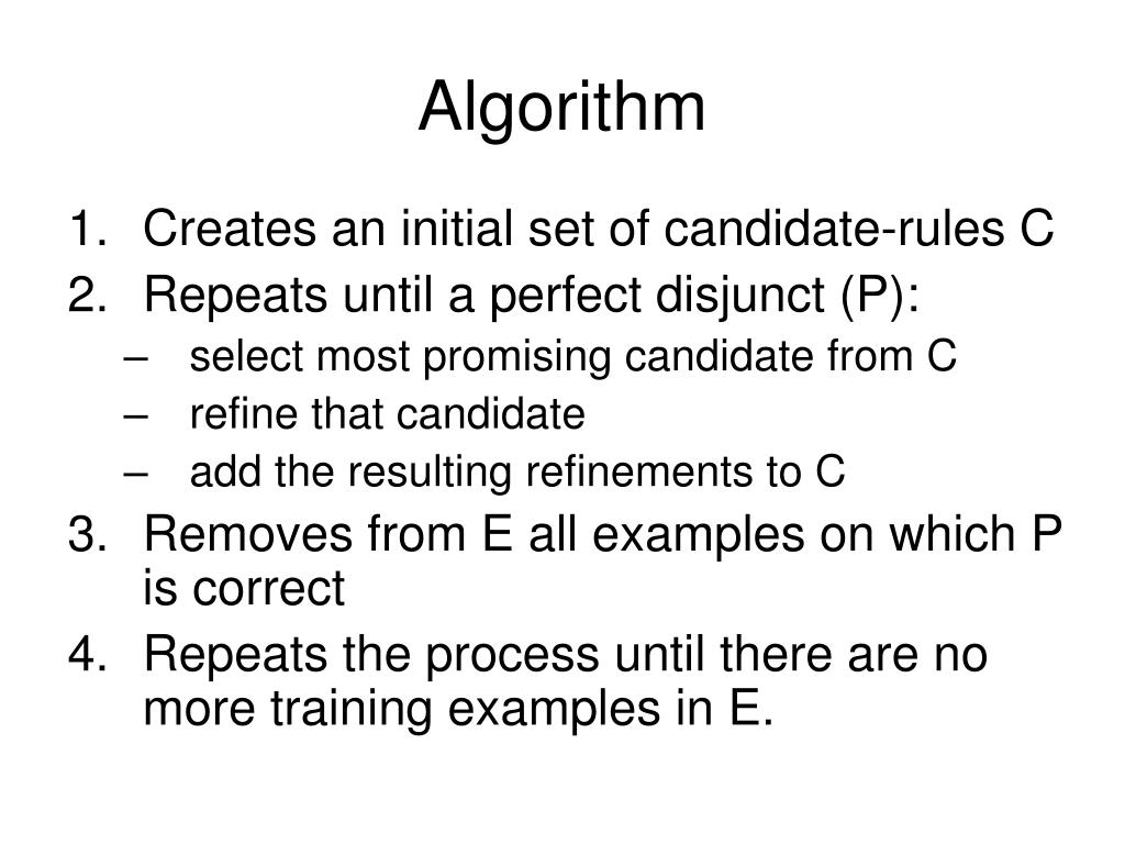 Algorithm • Creates an initial set of candidate-rules C • Repeats until a perfect disjunct (P): • select most promising candidate from C • refine that candidate • add the resulting refinements to C • Removes from E all examples on which P is correct • Repeats the process until there are no more training examples in E.