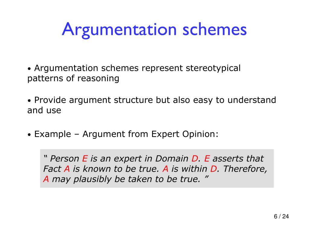 Argumentation schemes • Argumentation schemes represent stereotypical patterns of reasoning • Provide argument structure but also easy to understand and use • Example – Argument from Expert Opinion: “ Person E is an expert in Domain D. E asserts that Fact A is known to be true. A is within D. Therefore, A may plausibly be taken to be true.”