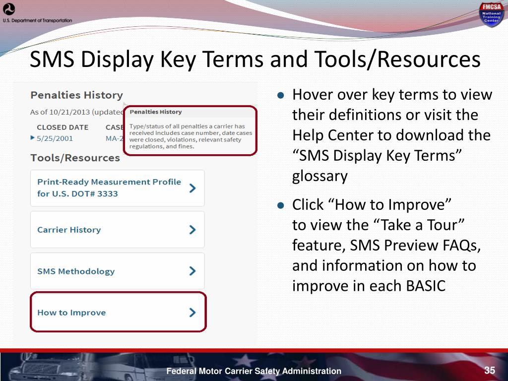 SMS Display Key Terms and Tools/Resources Hover over key terms to view their definitions or visit the Help Center to download the “SMS Display Key Terms” glossary Click “How to Improve” to view the “Take a Tour” feature, SMS Preview FAQs, and information on how to improve in each BASIC Federal Motor Carrier Safety Administration