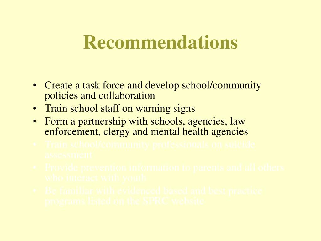 Recommendations • Create a task force and develop school/community policies and collaboration • Train school staff on warning signs • Form a partnership with schools, agencies, law enforcement, clergy and mental health agencies • Train school/community professionals on suicide assessment • Provide prevention information to parents and all others who interact with youth • Be familiar with evidenced based and best practice programs listed on the SPRC website