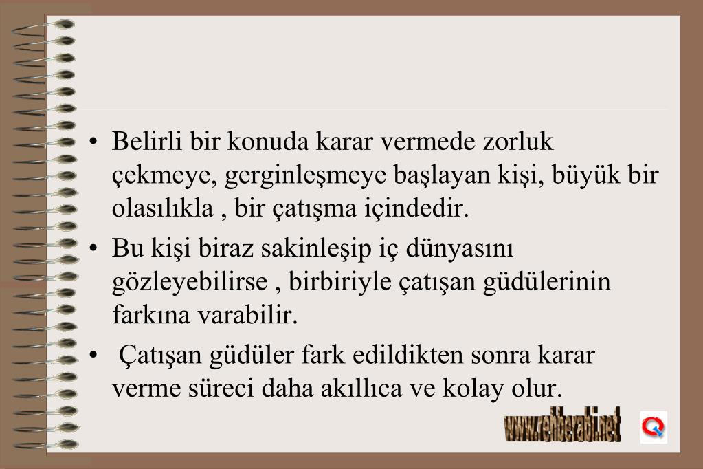 Belirli bir konuda karar vermede zorluk çekmeye, gerginleşmeye başlayan kişi, büyük bir olasılıkla , bir çatışma içindedir. • Bu kişi biraz sakinleşip iç dünyasını gözleyebilirse , birbiriyle çatışan güdülerinin farkına varabilir. • Çatışan güdüler fark edildikten sonra karar verme süreci daha akıllıca ve kolay olur. www.rehberabi.net