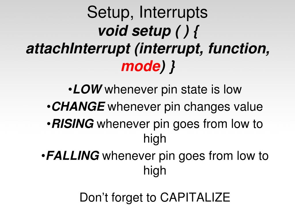 Setup, Interruptsvoid setup ( ){ attachInterrupt (interrupt, function, mode)} LOW whenever pin state is low CHANGE whenever pin changes value RISING whenever pin goes from low to high FALLING whenever pin goes from low to high Don’t forget to CAPITALIZE