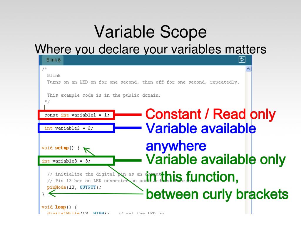 Setupvoid setup ( ){ pinMode (13, OUTPUT); } Outputs are declare in setup, this is done by using the pinModefunction This particular example declares digital pin # 13 as an output, remember to use CAPS