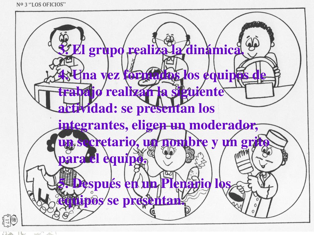 3. El grupo realiza la dinámica. 4. Una vez formados los equipos de trabajo realizan la siguiente actividad: se presentan los integrantes, eligen un moderador, un secretario, un nombre y un grito para el equipo. 5. Después en un Plenario los equipos se presentan.