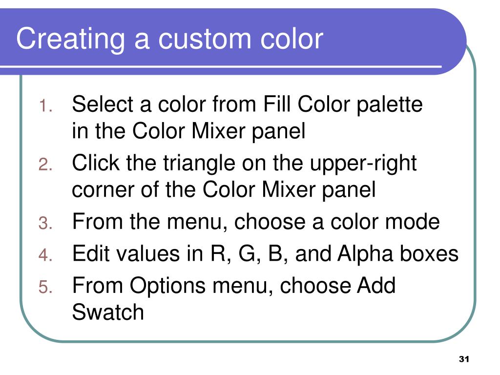 Creating a custom color • Select a color from Fill Color palette in the Color Mixer panel • Click the triangle on the upper-right corner of the Color Mixer panel • From the menu, choose a color mode • Edit values in R, G, B, and Alpha boxes • From Options menu, choose Add Swatch