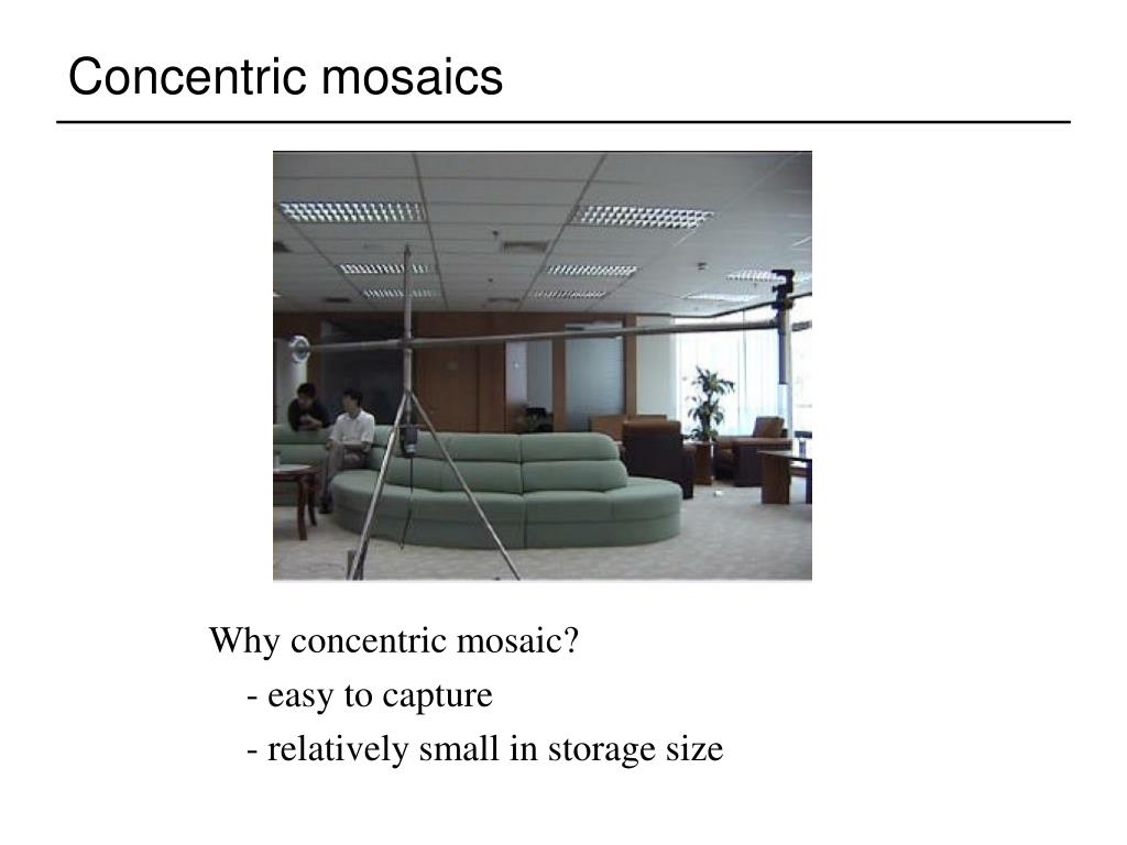 Concentric mosaics Why concentric mosaic? - easy to capture - relatively small in storage size