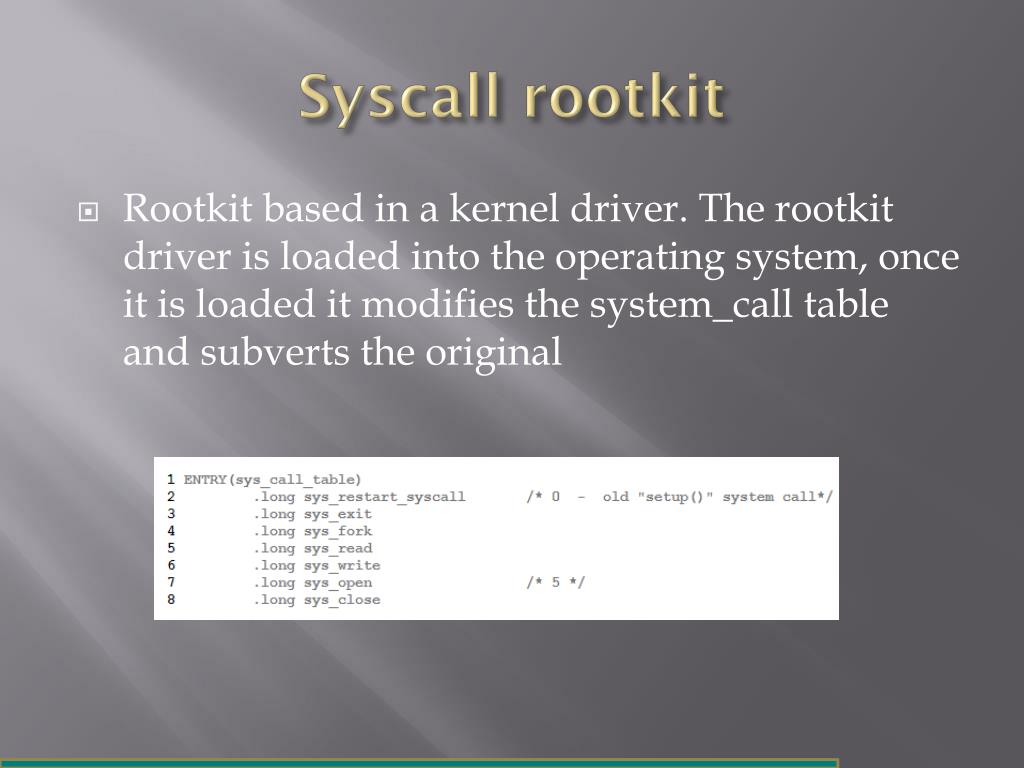 Syscall rootkit • Rootkit based in a kernel driver. The rootkit driver is loaded into the operating system, once it is loaded it modifies the system_call table and subverts the original