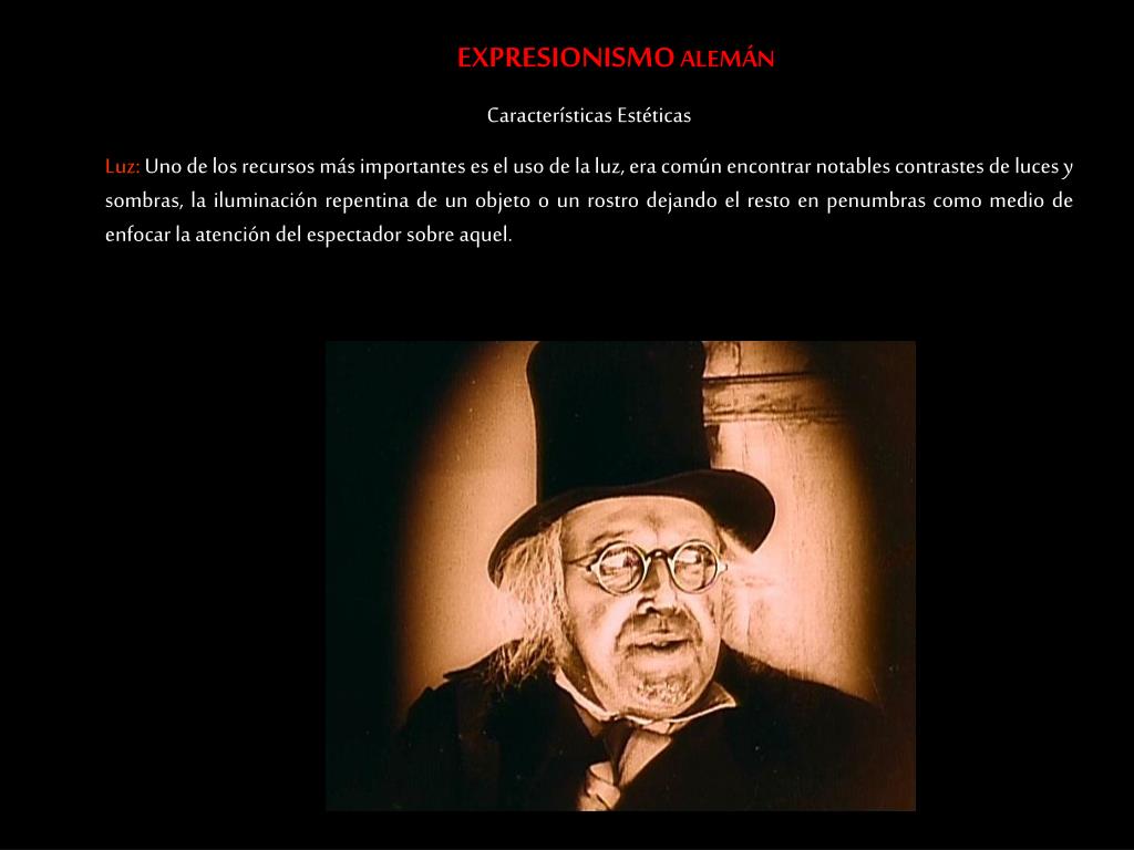 EXPRESIONISMO ALEMÁN Características Estéticas Luz: Uno de los recursos más importantes es el uso de la luz, era común encontrar notables contrastes de luces y sombras, la iluminación repentina de un objeto o un rostro dejando el resto en penumbras como medio de enfocar la atención del espectador sobre aquel. Antonio Machuca Ahumada, Abril 2009