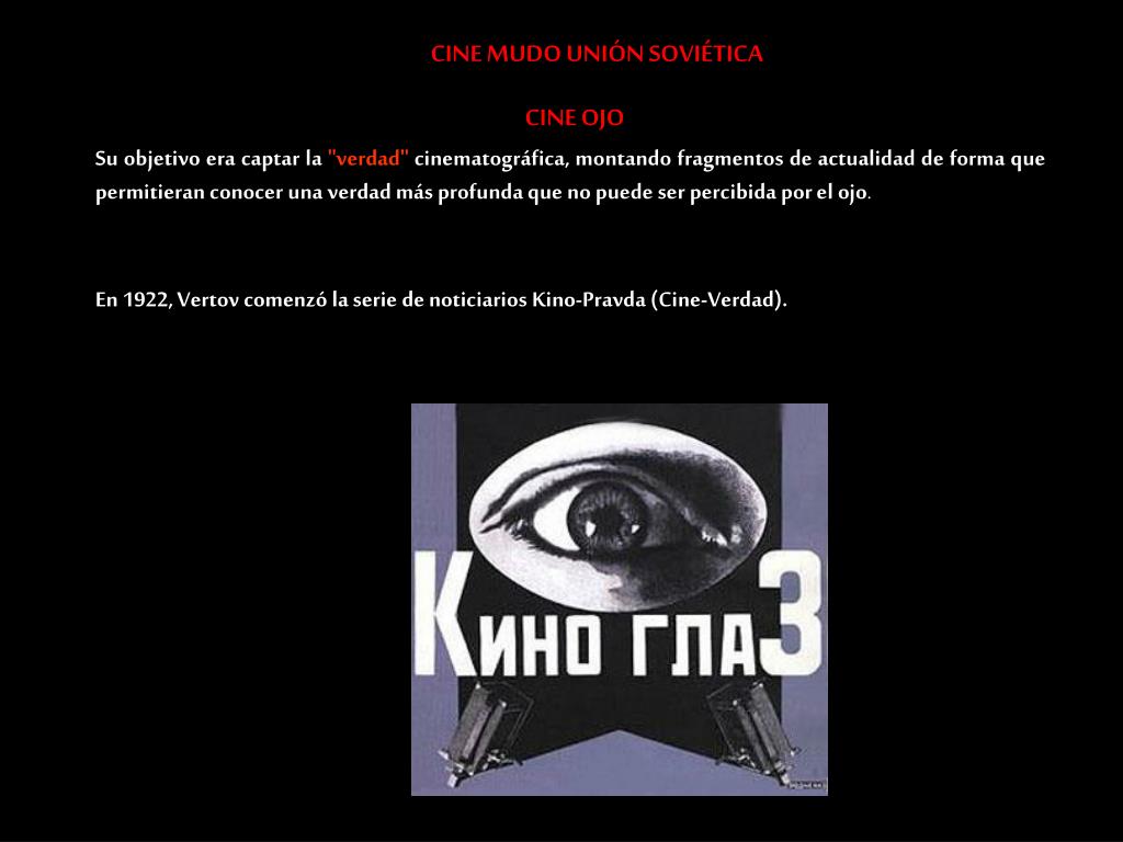 CINE MUDO UNIÓN SOVIÉTICA CINE OJO Su objetivo era captar la "verdad" cinematográfica, montando fragmentos de actualidad de forma que permitieran conocer una verdad más profunda que no puede ser percibida por el ojo. En 1922, Vertov comenzó la serie de noticiarios Kino-Pravda (Cine-Verdad). Antonio Machuca Ahumada, Abril 2009