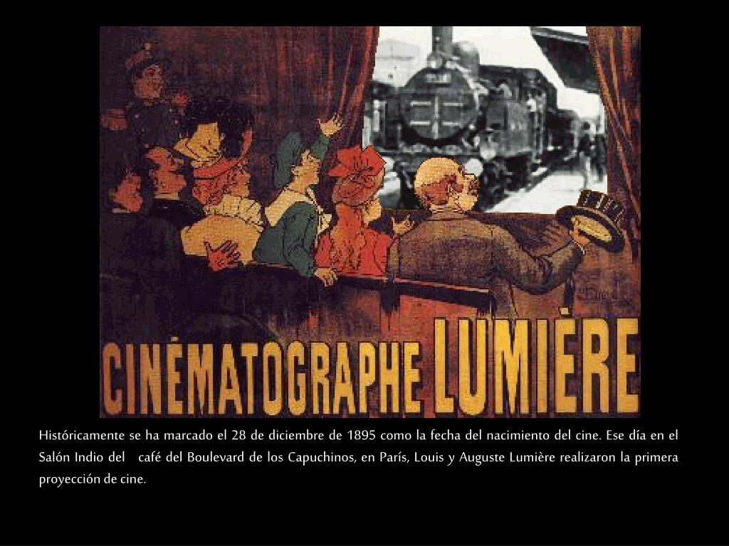 Históricamente se ha marcado el 28 de diciembre de 1895 como la fecha del nacimiento del cine. Ese día en el Salón Indio del café del Boulevard de los Capuchinos, en París, Louis y Auguste Lumière realizaron la primera proyección de cine. Antonio Machuca Ahumada, Abril 2009