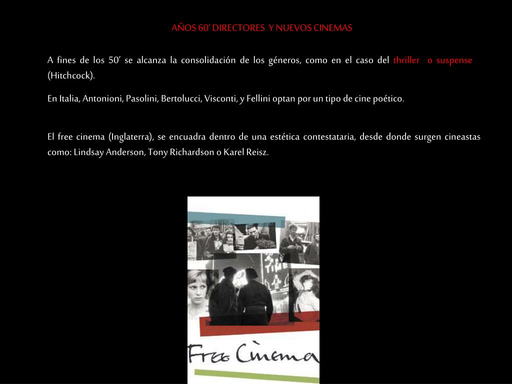 AÑOS 60’ DIRECTORES Y NUEVOS CINEMAS A fines de los 50’ se alcanza la consolidación de los géneros, como en el caso del thriller o suspense (Hitchcock). En Italia, Antonioni, Pasolini, Bertolucci, Visconti, y Fellini optan por un tipo de cine poético. El free cinema (Inglaterra), se encuadra dentro de una estética contestataria, desde donde surgen cineastas como: Lindsay Anderson, Tony Richardson o Karel Reisz. Antonio Machuca Ahumada, Abril 2009