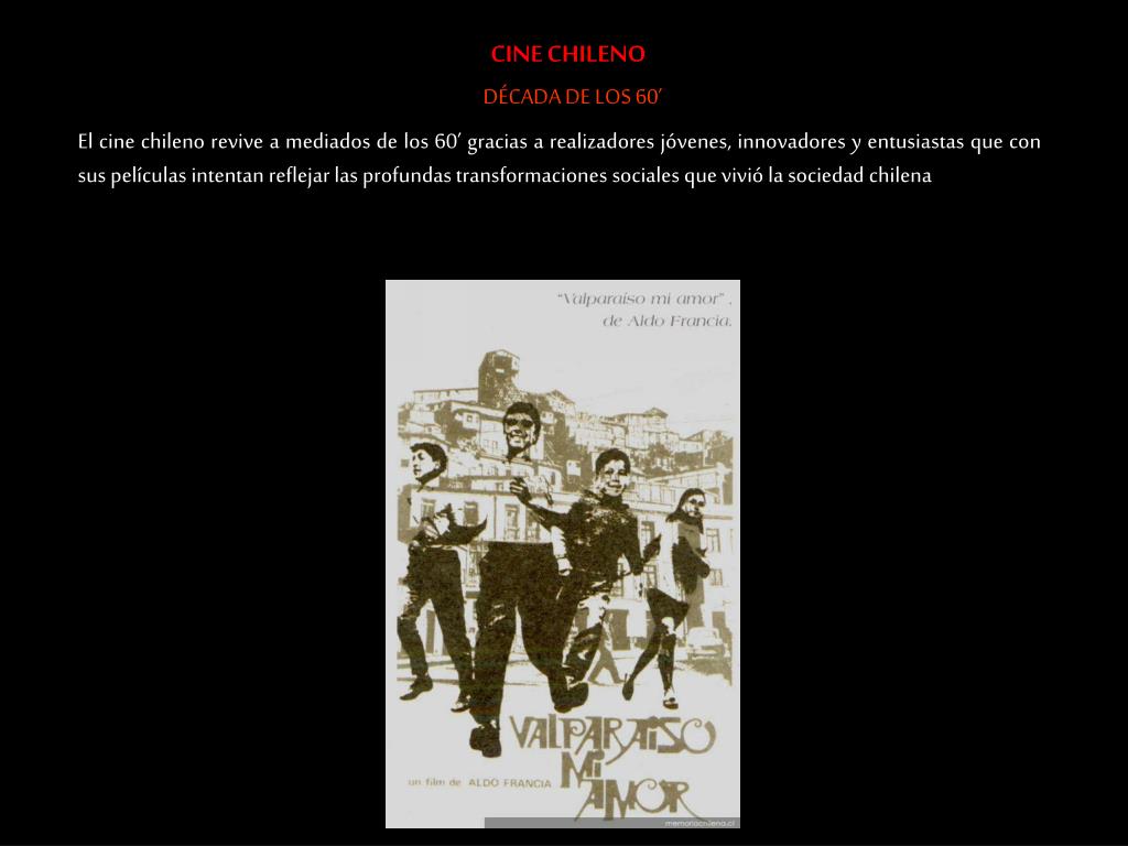 CINE CHILENO DÉCADA DE LOS 60’ El cine chileno revive a mediados de los 60’ gracias a realizadores jóvenes, innovadores y entusiastas que con sus películas intentan reflejar las profundas transformaciones sociales que vivió la sociedad chilena Antonio Machuca Ahumada, Abril 2009