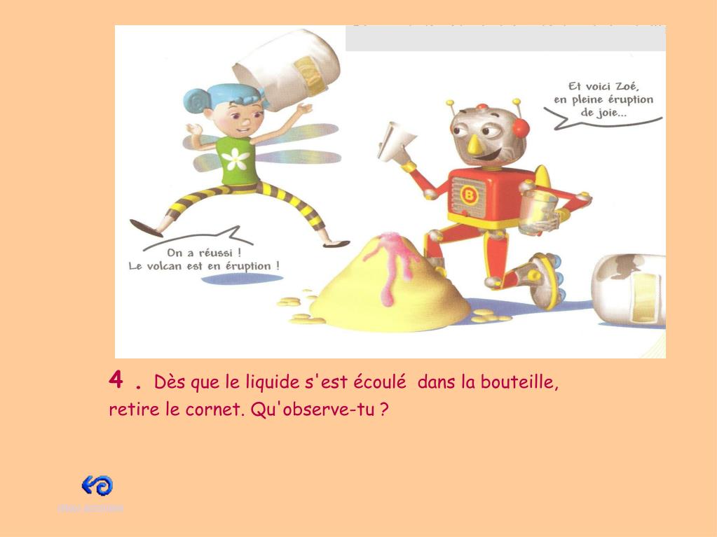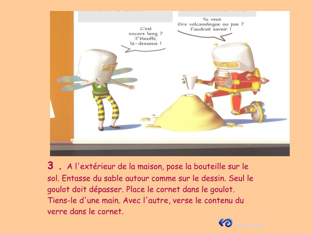 Expériences possibles à réaliser toi-même Créer une éruption volcanique Matériel : - une bouteille en plastique (25 cl) - une feuille de papier - une grande cuillère - un sachet de semoule - une boîte de bicarbonate de soude - une bouteille de sirop de grenadine - un verre - une bouteille de vinaigre blanc - du sable retour sommaire