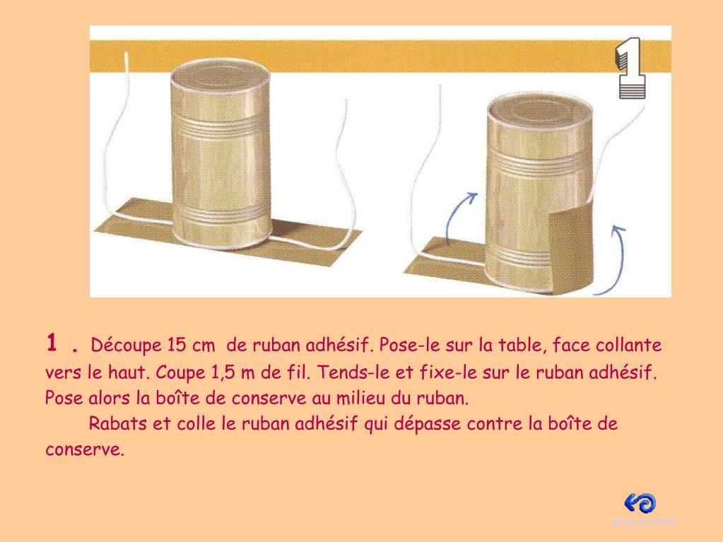 1 . Découpe 15 cm de ruban adhésif. Pose-le sur la table, face collante vers le haut. Coupe 1,5 m de fil. Tends-le et fixe-le sur le ruban adhésif. Pose alors la boîte de conserve au milieu du ruban. Rabats et colle le ruban adhésif qui dépasse contre la boîte de conserve. retour sommaire