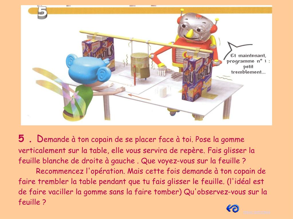5 . Demande à ton copain de se placer face à toi. Pose la gomme verticalement sur la table, elle vous servira de repère. Fais glisser la feuille blanche de droite à gauche . Que voyez-vous sur la feuille ? Recommencez l'opération. Mais cette fois demande à ton copain de faire trembler la table pendant que tu fais glisser le feuille. (l'idéal est de faire vaciller la gomme sans la faire tomber) Qu'observez-vous sur la feuille ? retour sommaire