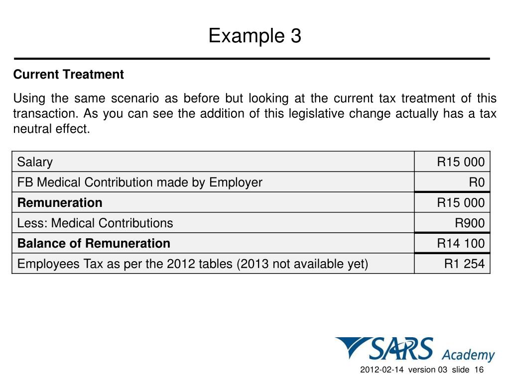 Example 3 Example 3: Employee Over 65 Stanley (66) contributes R900 to his medical aid and his employer contributes R1 000 on his behalf. Stanley has his wife on his medical aid scheme. Stanley has earned a salary of R15 000 for the month of April 2011. Calculate the applicable Employees Tax due on Stanley’s Remuneration. Suggested Solution: • 2012-02-14 version 03 slide 15