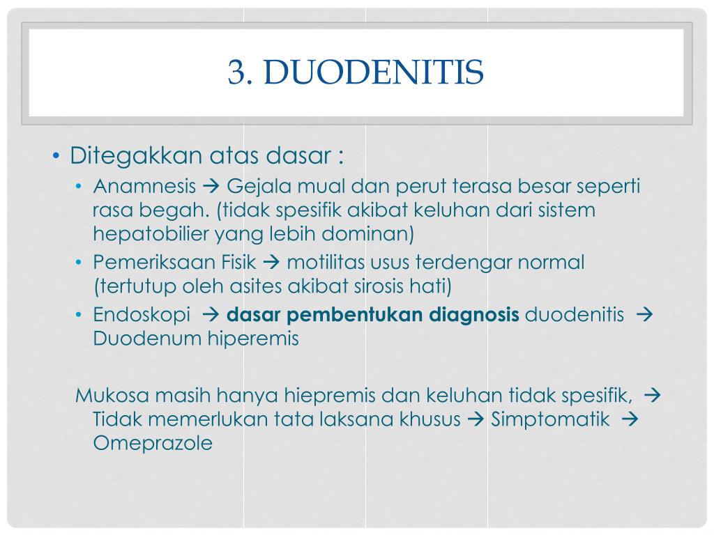 3. duodenitis • Ditegakkan atas dasar : • Anamnesis Gejala mual dan perut terasa besar seperti rasa begah. (tidak spesifik akibat keluhan dari sistem hepatobilier yang lebih dominan) • Pemeriksaan Fisik motilitas usus terdengar normal (tertutup oleh asites akibat sirosis hati) • Endoskopi dasar pembentukan diagnosis duodenitis Duodenum hiperemis Mukosa masih hanya hiepremis dan keluhan tidak spesifik, Tidak memerlukan tata laksana khusus Simptomatik Omeprazole
