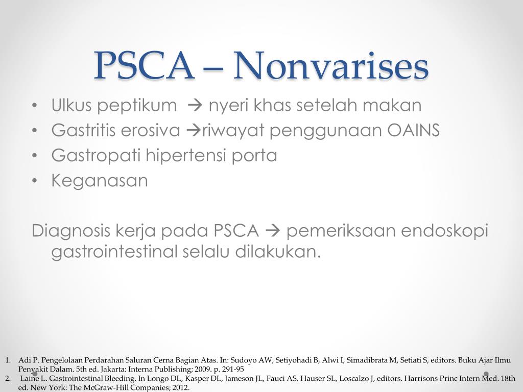 PSCA – Nonvarises • Ulkus peptikum nyeri khas setelah makan • Gastritis erosiva riwayat penggunaan OAINS • Gastropati hipertensi porta • Keganasan Diagnosis kerja pada PSCA pemeriksaan endoskopi gastrointestinal selalu dilakukan. • Adi P. Pengelolaan Perdarahan Saluran Cerna Bagian Atas. In: Sudoyo AW, Setiyohadi B, Alwi I, Simadibrata M, Setiati S, editors. Buku Ajar Ilmu Penyakit Dalam. 5th ed. Jakarta: Interna Publishing; 2009. p. 291-95 • Laine L. Gastrointestinal Bleeding. In Longo DL, Kasper DL, Jameson JL, Fauci AS, Hauser SL, Loscalzo J, editors. Harrisons Princ Intern Med. 18th ed. New York: The McGraw-Hill Companies; 2012.