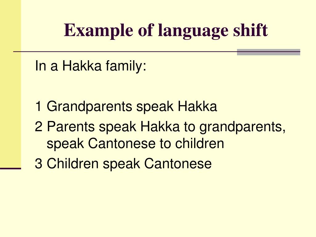 Example of language shift In a Hakka family: 1 Grandparents speak Hakka 2 Parents speak Hakka to grandparents, speak Cantonese to children 3 Children speak Cantonese