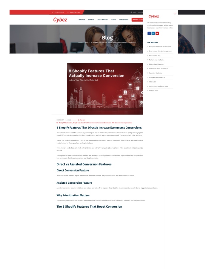 info@cybez.com Mon – Fri: 9:30am – 6:30pm +91 9717750297 ABOUT US SERVICES AUDIT SERVICES CLIENTS CASE STUDIES REQUEST A CALL We are niche E-commerce Marketing and Consulting Company helping brands to setup and scale their business online. Blog Our Services Home Blog 8 Shopify Features That Directly Increase Ecommerce Conversions Ecommerce Website Development E-commerce Website Management E-commerce SEO Performance Marketing Marketplace Marketing Conversion Rate Optimization Retention Marketing Competitive Intelligence SEO Audit Performance Marketing Audit Website Audit Atul Jain FEBRUARY 17, 2026 Shopify UX Optimization, Shopify Sales Growth, GA4 for eCommerce, Conversion Optimization, CRO (Conversion Rate Optimization) 8 Shopify Features That Directly Increase Ecommerce Conversions Most Shopify stores don’t fail because of poor design or lack of tra?c—they fail because invisible friction quietly kills buying intent. Store owners install CRO apps, follow popular checklists, tweak layouts, and still see conversion rates stall. The problem isn’t effort; it’s focus. Brands that grow consistently are the ones that identify these high-impact features, implement them correctly, and measure what truly moves the needle instead of chasing surface-level optimizations. Some improve aesthetics, some help with analytics, and only a few actually reduce hesitation at the exact moment a shopper decides whether to buy or leave. In this guide, we break down 8 Shopify features that directly or indirectly in?uence conversions, explain where they shape buyer behavior, and show how to measure their impact using GA4 and Shopify analytics. Direct vs Assisted Conversion Features Direct Conversion Feature Direct conversion features impact purchases in the same session. They remove friction and drive immediate action. Assisted Conversion Feature Assisted conversion features build trust and reduce hesitation. They improve the probability of conversion but usually do not trigger instant purchases. Why Prioritization Matters Implementing direct levers ?rst ensures immediate uplift. Assisted levers should follow to reinforce credibility and long-term growth. The 8 Shopify Features That Boost Conversion