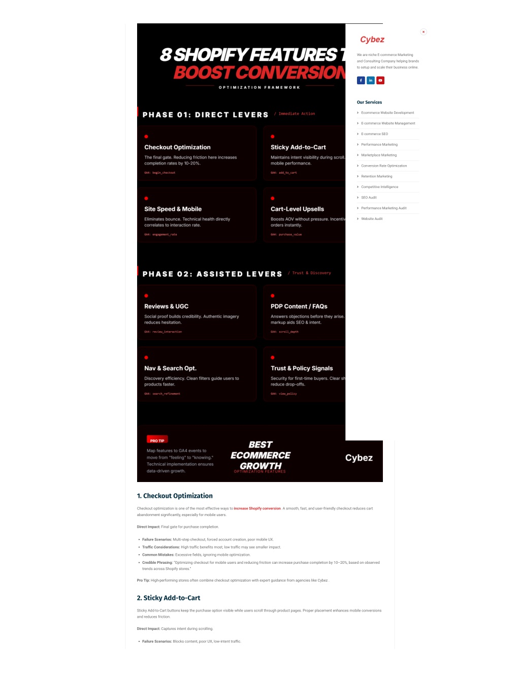 We are niche E-commerce Marketing and Consulting Company helping brands to setup and scale their business online. Our Services Ecommerce Website Development E-commerce Website Management E-commerce SEO Performance Marketing Marketplace Marketing Conversion Rate Optimization Retention Marketing Competitive Intelligence SEO Audit Performance Marketing Audit Website Audit 1. Checkout Optimization Checkout optimization is one of the most effective ways to increase Shopify conversion. A smooth, fast, and user-friendly checkout reduces cart abandonment signi?cantly, especially for mobile users. Direct Impact: Final gate for purchase completion. Failure Scenarios: Multi-step checkout, forced account creation, poor mobile UX. Tra?c Considerations: High tra?c bene?ts most; low tra?c may see smaller impact. Common Mistakes: Excessive ?elds, ignoring mobile optimization. Credible Phrasing: “Optimizing checkout for mobile users and reducing friction can increase purchase completion by 10–20%, based on observed trends across Shopify stores.” Pro Tip: High-performing stores often combine checkout optimization with expert guidance from agencies like Cybez . 2. Sticky Add-to-Cart Sticky Add-to-Cart buttons keep the purchase option visible while users scroll through product pages. Proper placement enhances mobile conversions and reduces friction. Direct Impact: Captures intent during scrolling. Failure Scenarios: Blocks content, poor UX, low-intent tra?c.