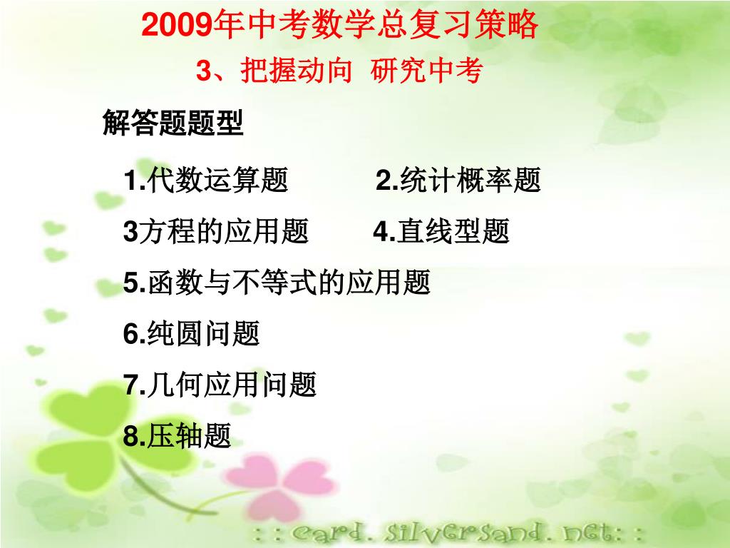2009年中考数学总复习策略 3、把握动向 研究中考 解答题题型 1.代数运算题 2.统计概率题 3方程的应用题 4.直线型题 5.函数与不等式的应用题 6.纯圆问题 7.几何应用问题 8.压轴题