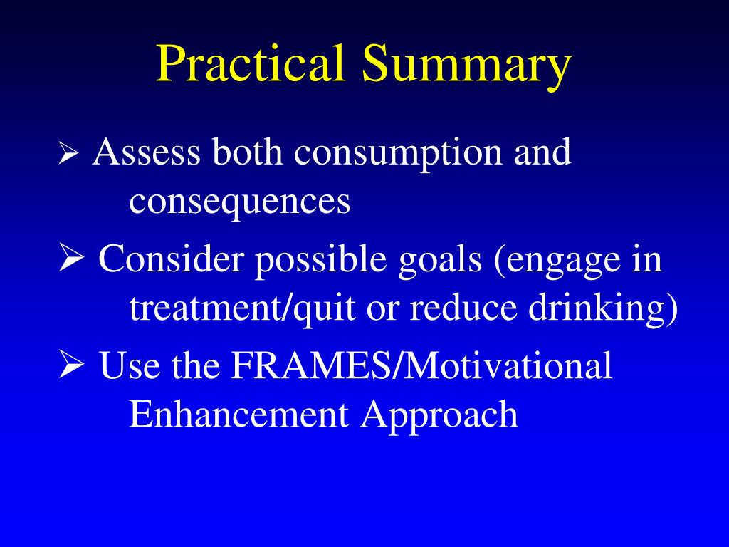 Practical Summary • Assess both consumption and consequences • Consider possible goals (engage in treatment/quit or reduce drinking) • Use the FRAMES/Motivational Enhancement Approach