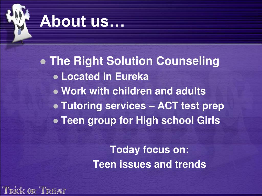 About us… • The Right Solution Counseling • Located in Eureka • Work with children and adults • Tutoring services – ACT test prep • Teen group for High school Girls Today focus on: Teen issues and trends