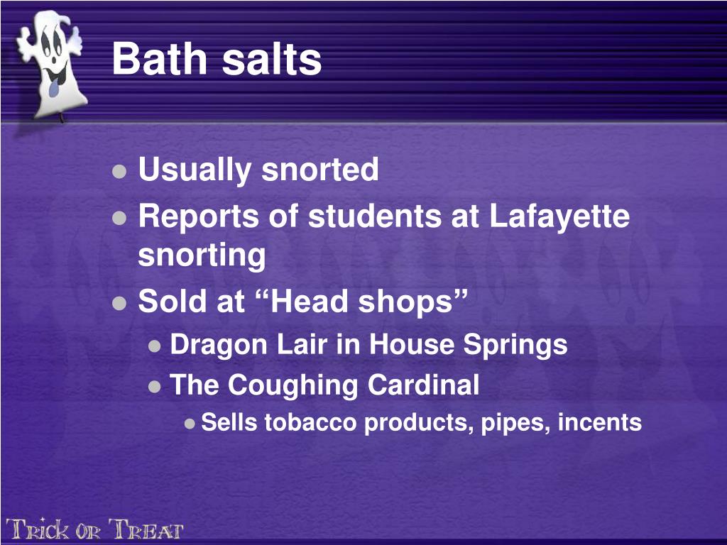 Bath salts • Usually snorted • Reports of students at Lafayette snorting • Sold at “Head shops” • Dragon Lair in House Springs • The Coughing Cardinal • Sells tobacco products, pipes, incents
