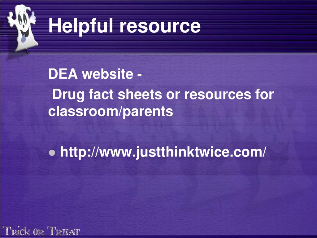 Helpful resource DEA website - Drug fact sheets or resources for classroom/parents • http://www.justthinktwice.com/