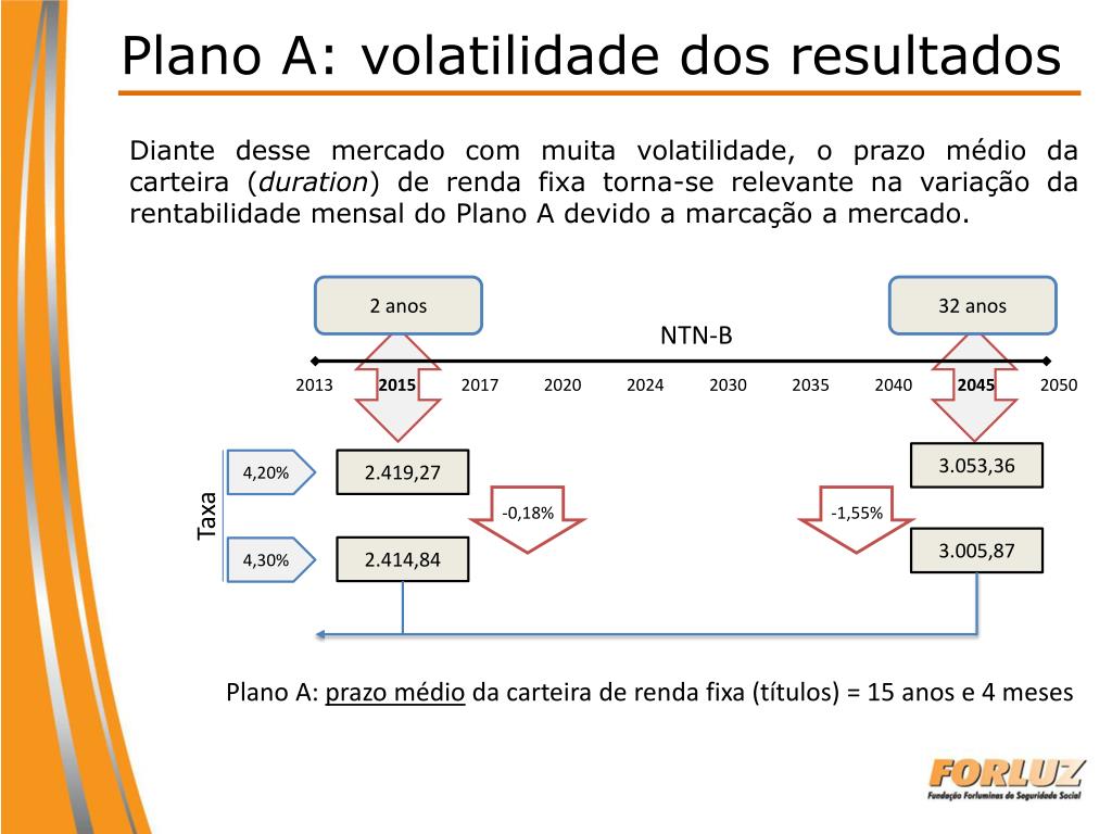 Plano A: volatilidade dos resultados Diante desse mercado com muita volatilidade, o prazo médio da carteira (duration) de renda fixa torna-se relevante na variação da rentabilidade mensal do Plano A devido a marcação a mercado. 2 anos 32 anos NTN-B 2013 2015 2017 2020 2024 2030 2035 2040 2045 2050 3.053,36 2.419,27 Taxa 4,20% -0,18% -1,55% 3.005,87 2.414,84 4,30% Plano A: prazo médio da carteira de renda fixa (títulos) = 15 anos e 4 meses