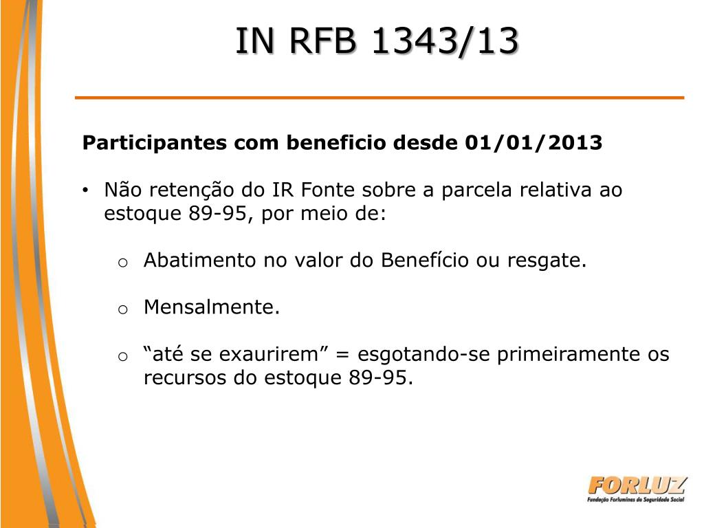 IN RFB 1343/13 • Participantes com beneficio desde 01/01/2013 • Não retenção do IR Fonte sobre a parcela relativa ao estoque 89-95, por meio de: • Abatimento no valor do Benefício ou resgate. • Mensalmente. • “até se exaurirem” = esgotando-se primeiramente os recursos do estoque 89-95.