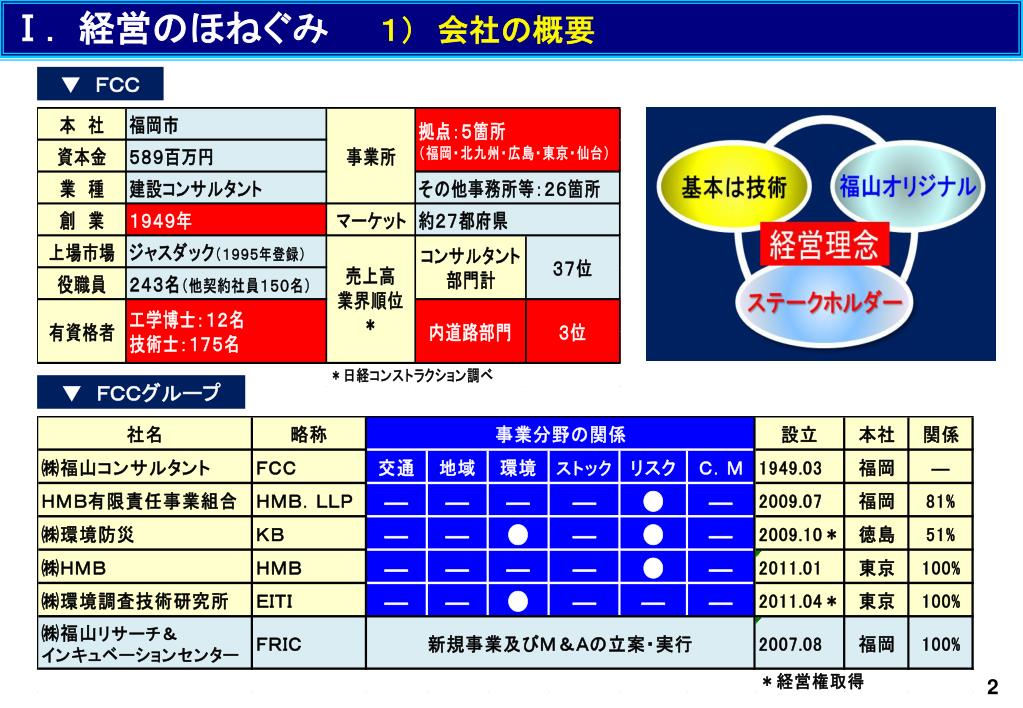 会社説明会. 平成24年6月期第2四半期決算. Ⅰ .経営のほねぐみ Ⅱ .主な事業展開 Ⅲ .ロードマップ Ⅳ .業績の動向と見通し. 平成24年3月9日 於 ANAクラウンプラザホテル福岡 . (株)福山コンサルタント. コード:9608. Ⅰ. 経営のほねぐみ 1) 会社の概要. ▼ FCC. ▼ FCCグループ. 2. Ⅰ. 経営のほねぐみ 2) 経営モデル. ▼ 経営計画の立案~実行. ▼ グループ会社の運営. ビジネス・プロジュース 機能の強化(FRIC). 3.