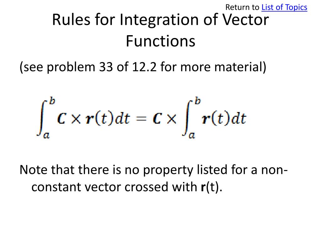 Return to List of Topics Rules for Integration of Vector Functions (see problem 33 of 12.2 for more material) Note that there is no property listed for a non-constant vector crossed with r(t).