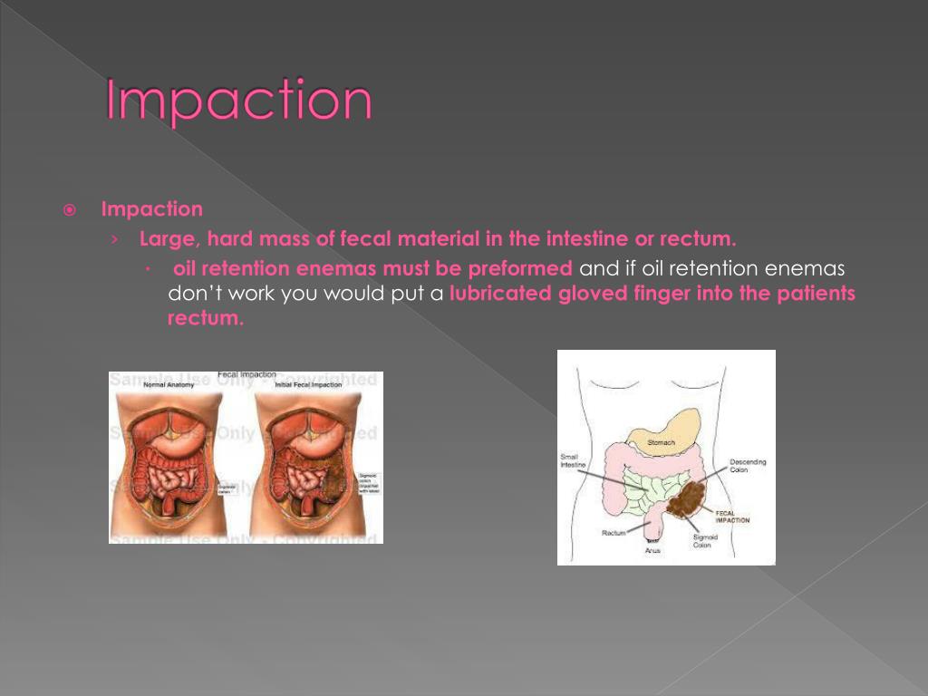 Impaction • Impaction • Large, hard mass of fecal material in the intestine or rectum. • oil retention enemas must be preformedand if oil retention enemas don’t work you would put a lubricated gloved finger into the patients rectum.