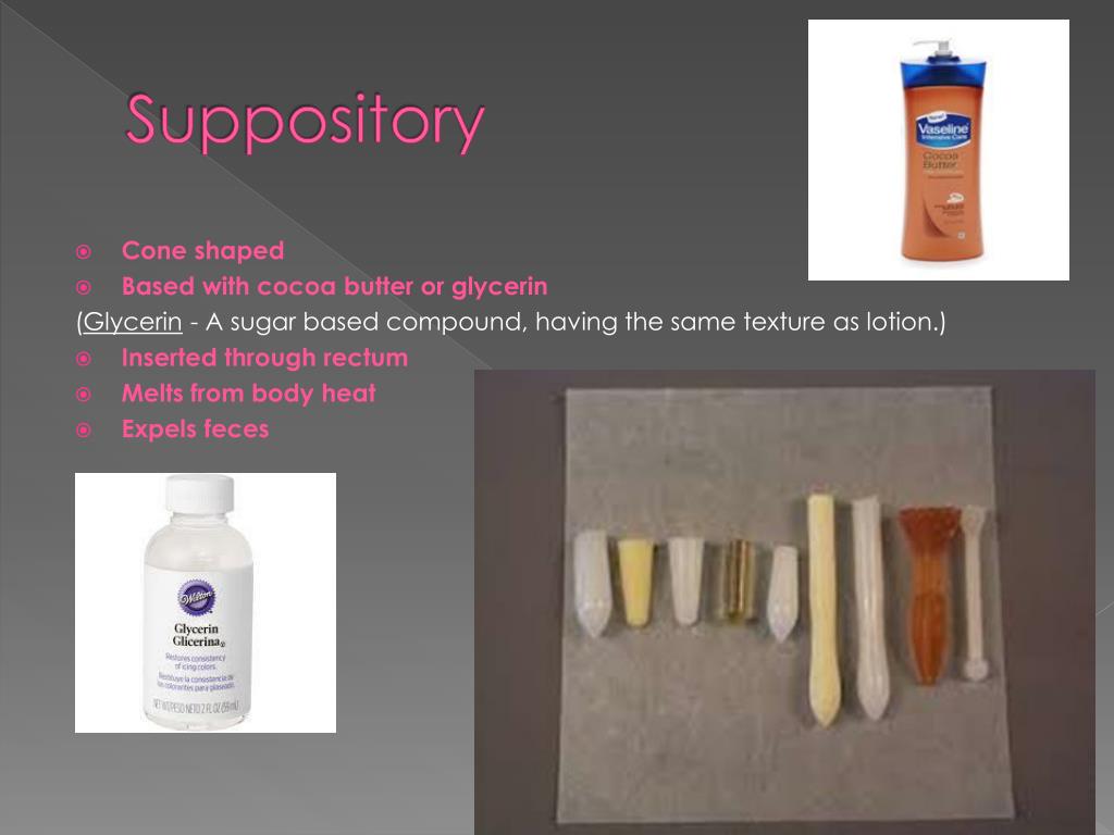 Suppository • Cone shaped • Based with cocoa butter or glycerin (Glycerin - A sugar based compound, having the same texture as lotion.) • Inserted through rectum • Melts from body heat • Expels feces