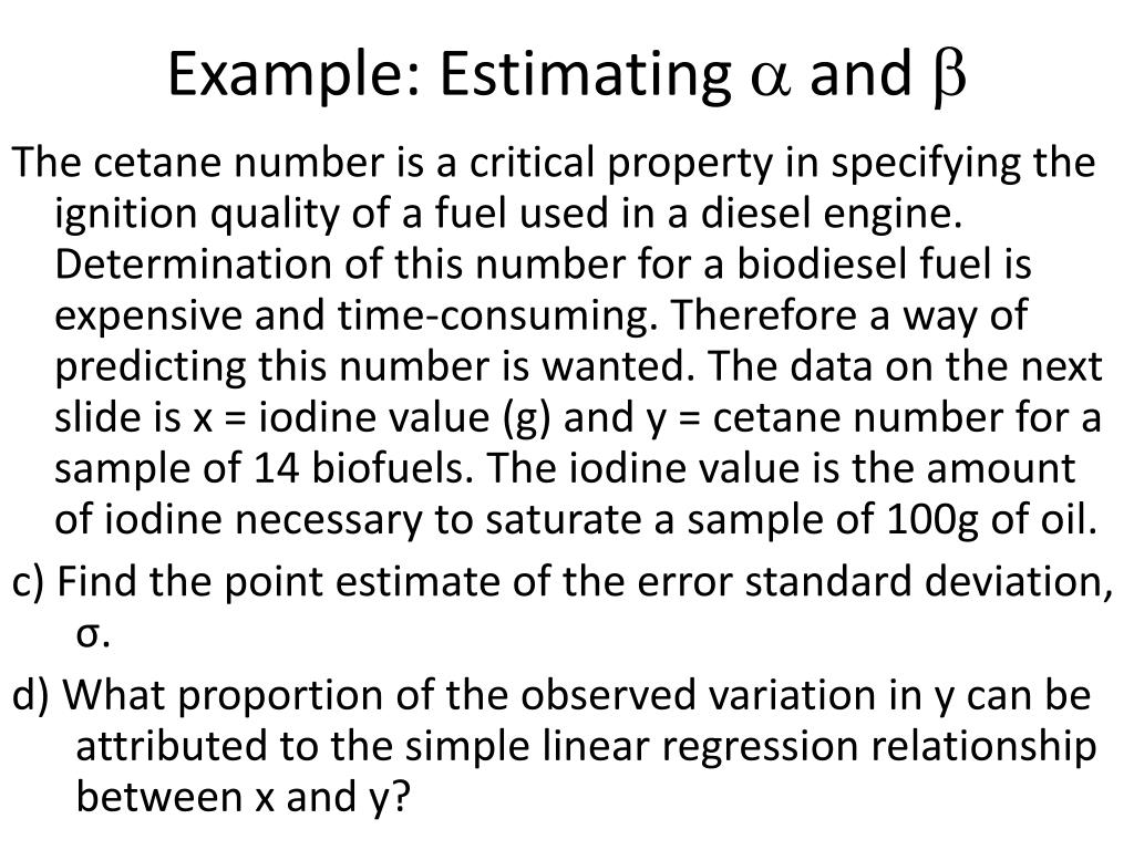 Example: Estimating and The cetane number is a critical property in specifying the ignition quality of a fuel used in a diesel engine. Determination of this number for a biodiesel fuel is expensive and time-consuming. Therefore a way of predicting this number is wanted. The data on the next slide is x = iodine value (g) and y = cetane number for a sample of 14 biofuels. The iodine value is the amount of iodine necessary to saturate a sample of 100g of oil. c) Find the point estimate of the error standard deviation, σ. d) What proportion of the observed variation in y can be attributed to the simple linear regression relationship between x and y?