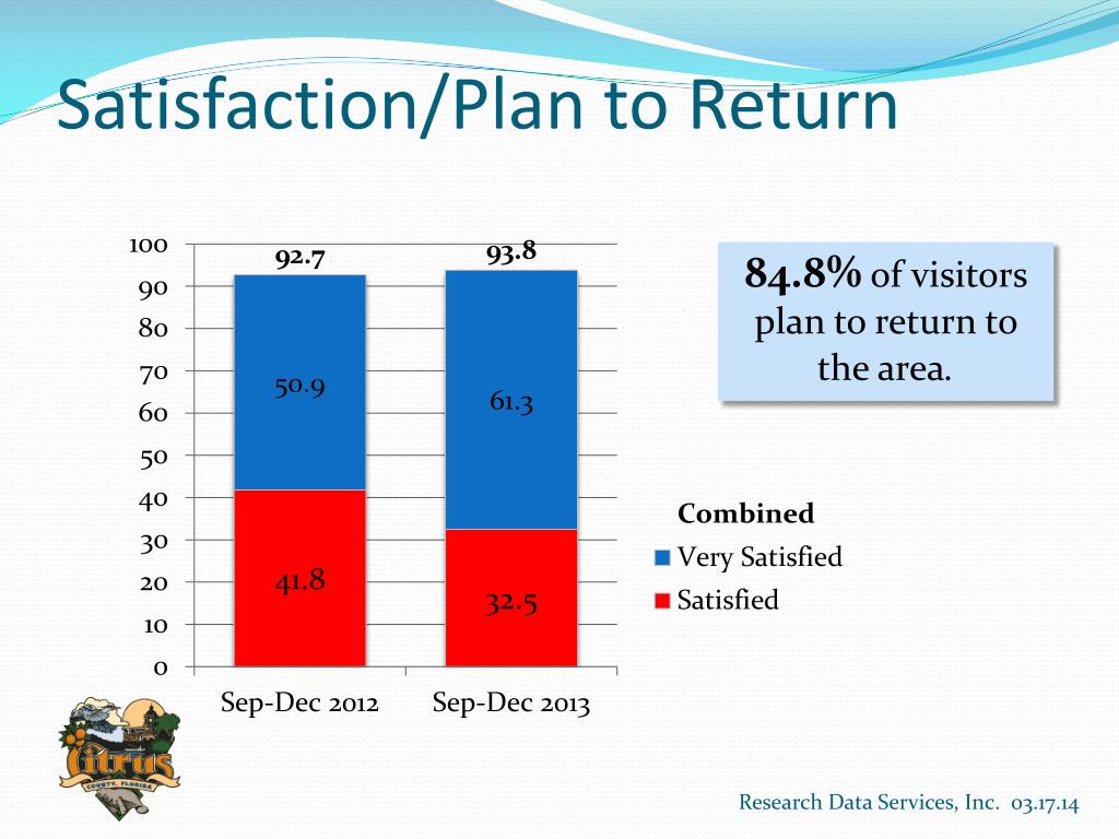 Satisfaction/Plan to Return 84.8%of visitors plan to return to the area.