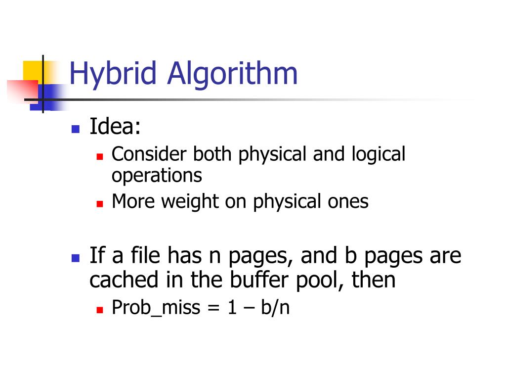 Hybrid Algorithm • Idea: • Consider both physical and logical operations • More weight on physical ones • If a file has n pages, and b pages are cached in the buffer pool, then • Prob_miss = 1 – b/n